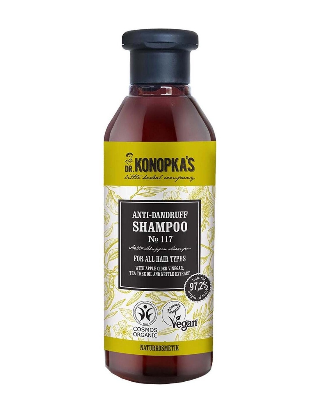 DR. KONOPKA´SEste champú está formulado para liberar el cuero cabelludo de la caspa. El vinagre de sidra de manzana, el aceite de árbol de té y el extracto de ortiga orgánicos equilibran y calman el cuero cabelludo, ayudan a eliminar las escamas y proporcionan una limpieza profunda y una sensación de frescor y confort. Certificado BDIH Cosmos Organic y Vegan.