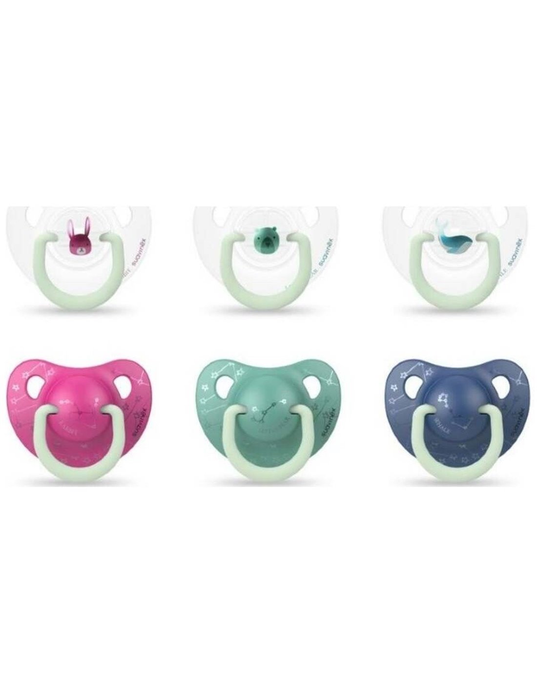 SUAVINEXCon tetinas anatómicas de silicona y anillas luminiscentes que brillan en la oscuridad. Se presentan en un pack de dos unidades, un chupete especial para el día y otro chupete para la noche aunque ambos chupetes disponen de la anilla luminiscente que brilla en la oscuridad para encontrar el chupete fácilmente en la cuna del bebé si se le cae. La tetina anatómica imita la forma del pezón materno durante la succión y se adapta perfectamente al paladar del bebé. La silicona es un material altamente resistente e indeformable que no altera su color ni olor. Tetinas aprobadas por la Sociedad Española de Odontopediatría.\ \ *El color y/o diseño del producto puede variar.