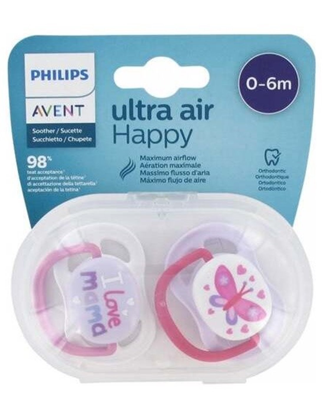 Pack de 2 chupetes tipo Ultra Air, para bebés de 0 a 6 meses, equipados con orificios más grandes que mantienen la piel del contorno de la boca seca, reduciendo el riesgo de producir irritaciones. Su escudo brilla en la oscuridad, haciéndolo más sencillo de encontrar durante la noche. Su forma anatómica se adapta perfectamente a las mejillas del bebé por lo que respeta la forma natural de paladar, dientes y encías, favoreciendo el desarrollo bucodental. *El color y diseño del producto pueden variar según la disponibilidad.