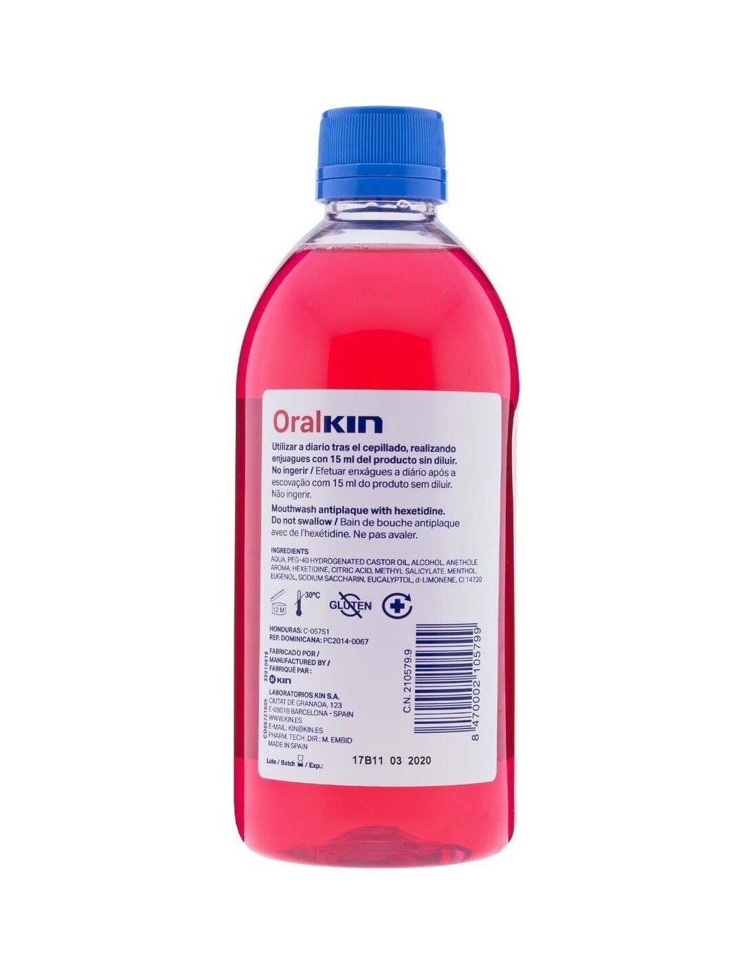 Kin Oralkin enjuague bucal contiene hexetidina, un eficaz antiséptico que ayuda a proteger la boca de forma integral frente a los gérmenes que constituyen la placa bacteriana. De uso diario.