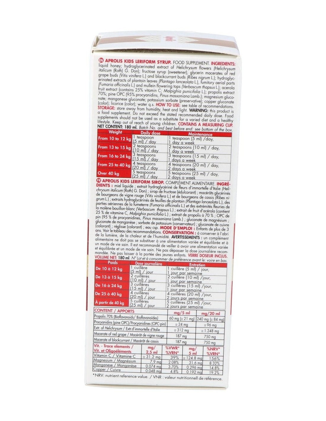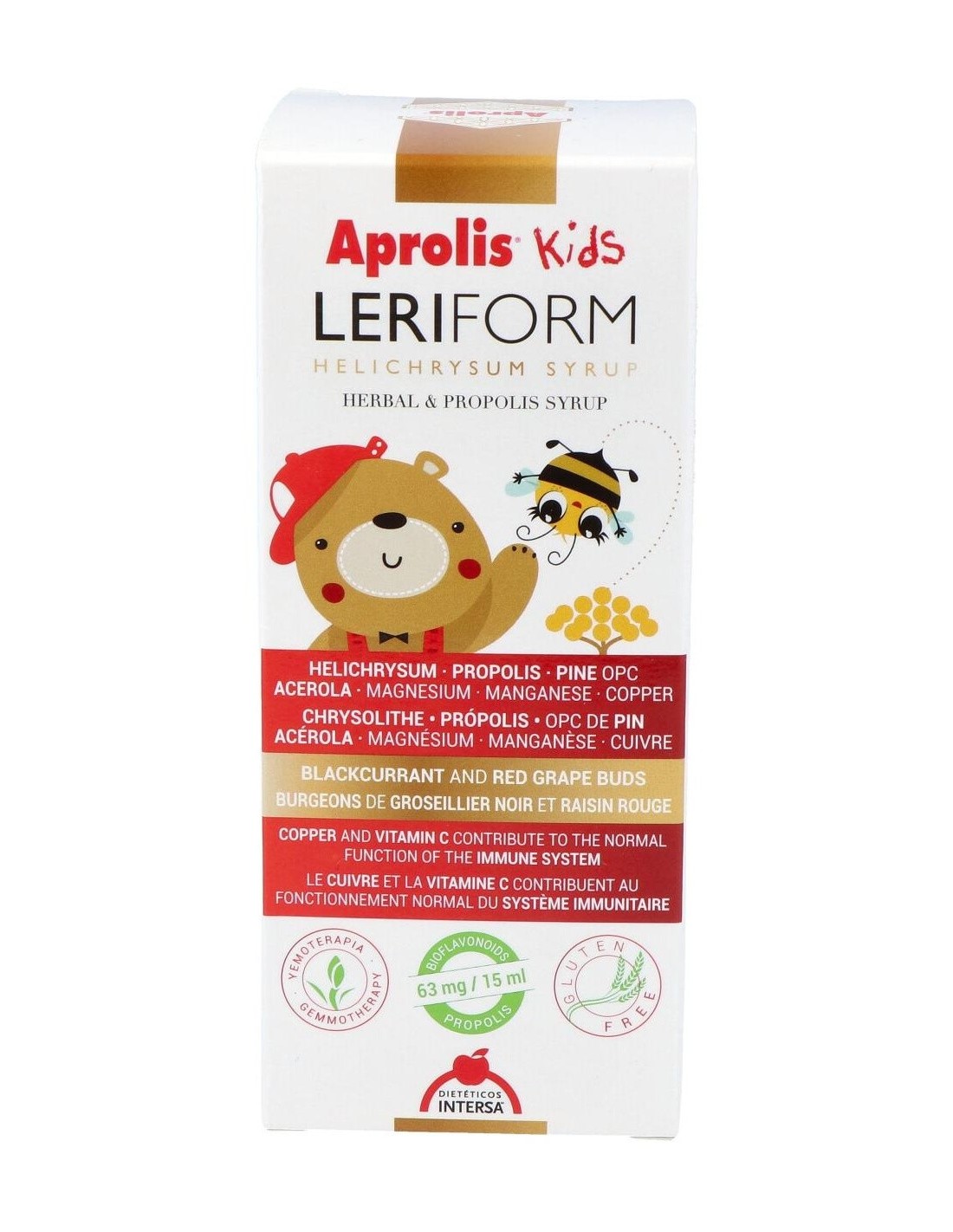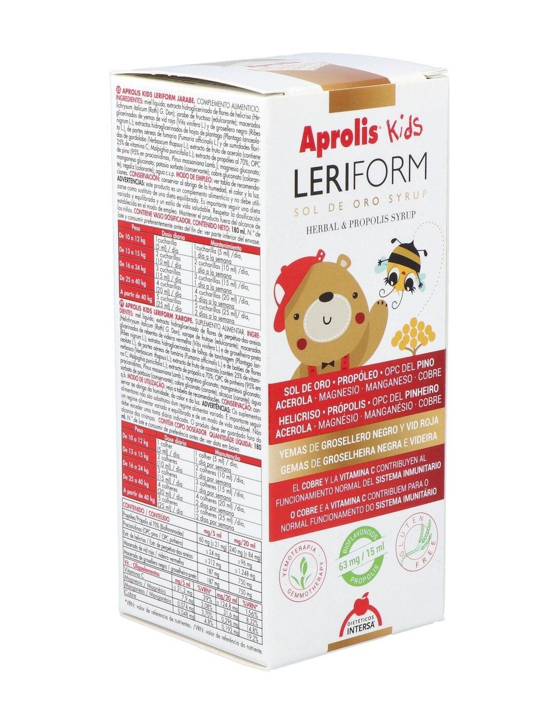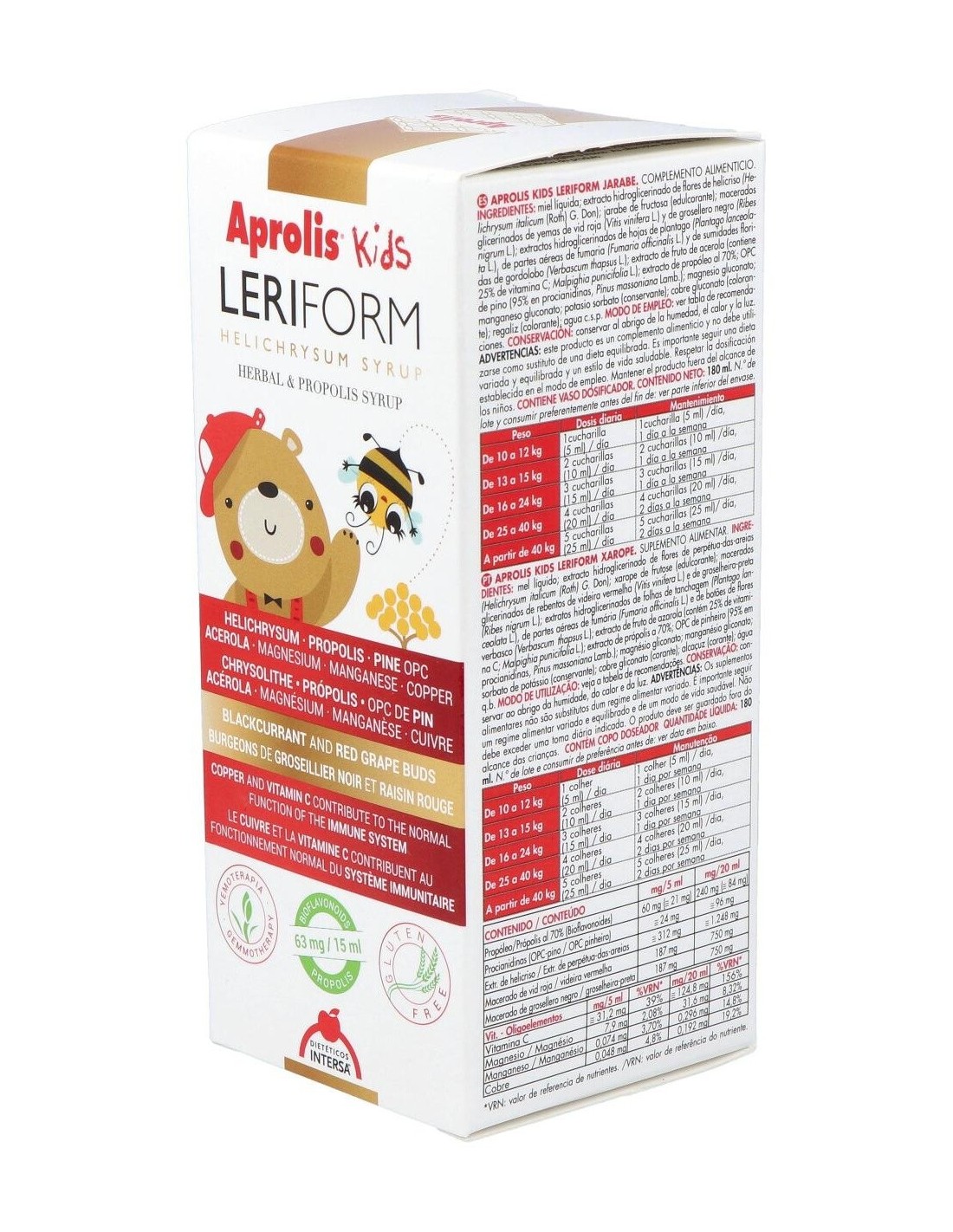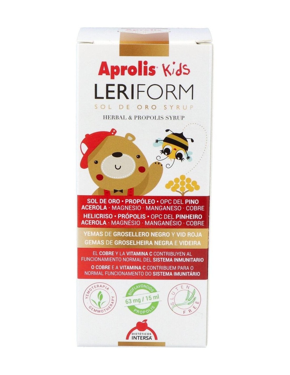 Aprolis Kids Leriform Jarabe 180ml es un jarabe pediátrico indicado para aumentar las defensas de los más pequeños. Gracias a su combinación de miel, propóleo y jalea real junto con la vitamina C y la oligoterapia hacen de este jarabe una formulación ideal para fortalecer el sistema inmunitario de los niños.