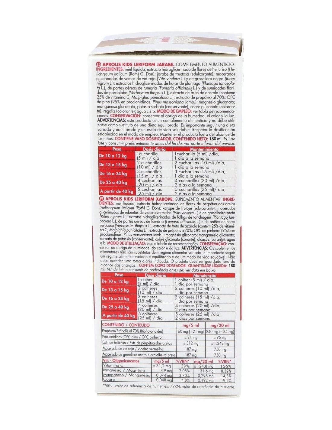 MIEL LÍQUIDA. EXTRACTOS HIDROGLICERINOLADOS DE: HELICRISO (HELICHRYSUM ITALICUM (ROTH) G.DON), GORDOLOBO (VERBASCUM THAPSUS L.), FUMARIA (FUMARIA OFFICINALIS L.) Y PLANTAGO (PLANTAGO LANCEOLATA L.).MACERADOS GLICEROLINADOS DE: GROSELLERO NEGRO (RIBES NIGRUM L.) Y VID ROJA (VITIS VINIFERA L.). EXTRACTO DE PROPÓLEO AL 70% (35% BIOFLAVONOIDES). EXTRACTO DE FRUTO DE ACEROLA (CONTIENE 25% DE VITAMINA C; MALPIGHIA PUNICIFOLIA L.) OPC DE PINO (95% EN PROCIANIDINAS, PINUS MASSONIANA LAMB). MAGNESIO GLUCONATO; MANGANESO GLUCONATO; COBRE GLUCONATO. EXCIPIENTES: JARABE DE FRUCTOSA (EDULCORANTE); REGALIZ (COLORANTE); POTASIO SORBATO (CONSERVANTE); AGUA CSP.