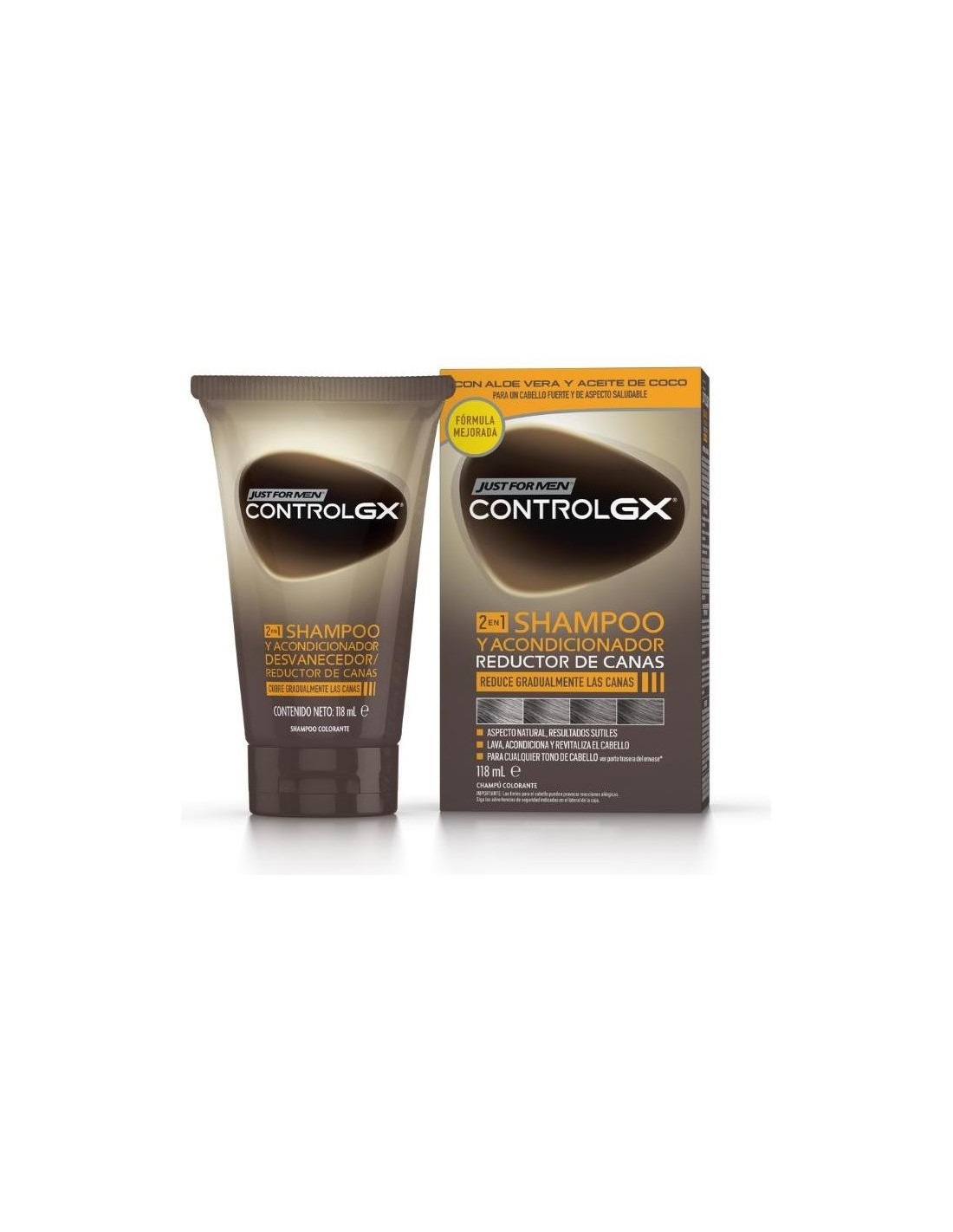 Just For Men Control GX Champú y Acondicionador Reductor de Canas es un producto multifunción: lava el cabello con suavidad a la vez que ayuda a reducir las canas de forma gradual y aporta una apariencia natural. Además de ayudar a recuperar el tono del color del cabello, Just For Men Control GX Champú y Acondicionador Reductor de Canas ayuda a potenciar el volumen y el grosor del cabello. Asimismo, al ser también acondicionador, deja el pelo suave y sedoso.