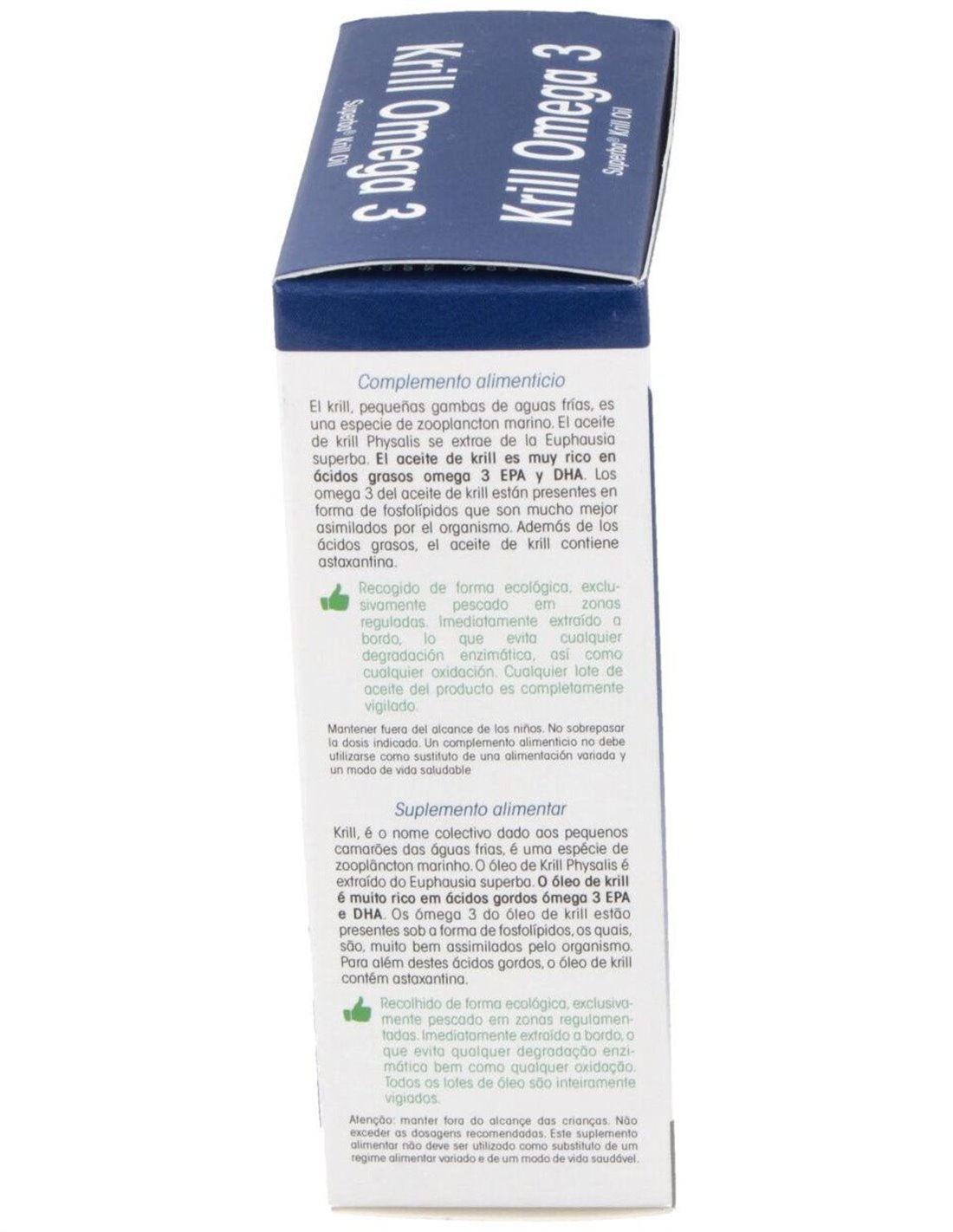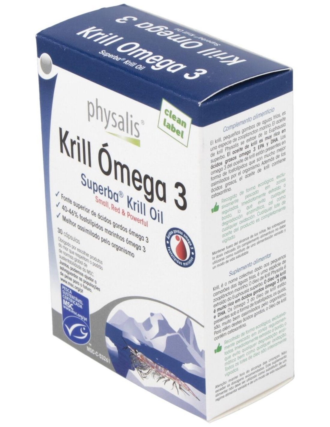 Complemento alimenticio a base de krill. Estas pequeñas gambas de aguas frías es una especie de zooplancton marino que ayuda a mejorar los lípidos en la sangre, contribuyendo a mejorar la salud del corazón y del sistema nervioso. Su alto contenido en Omega-3 ayuda a mejorar la concentración y la memoria.