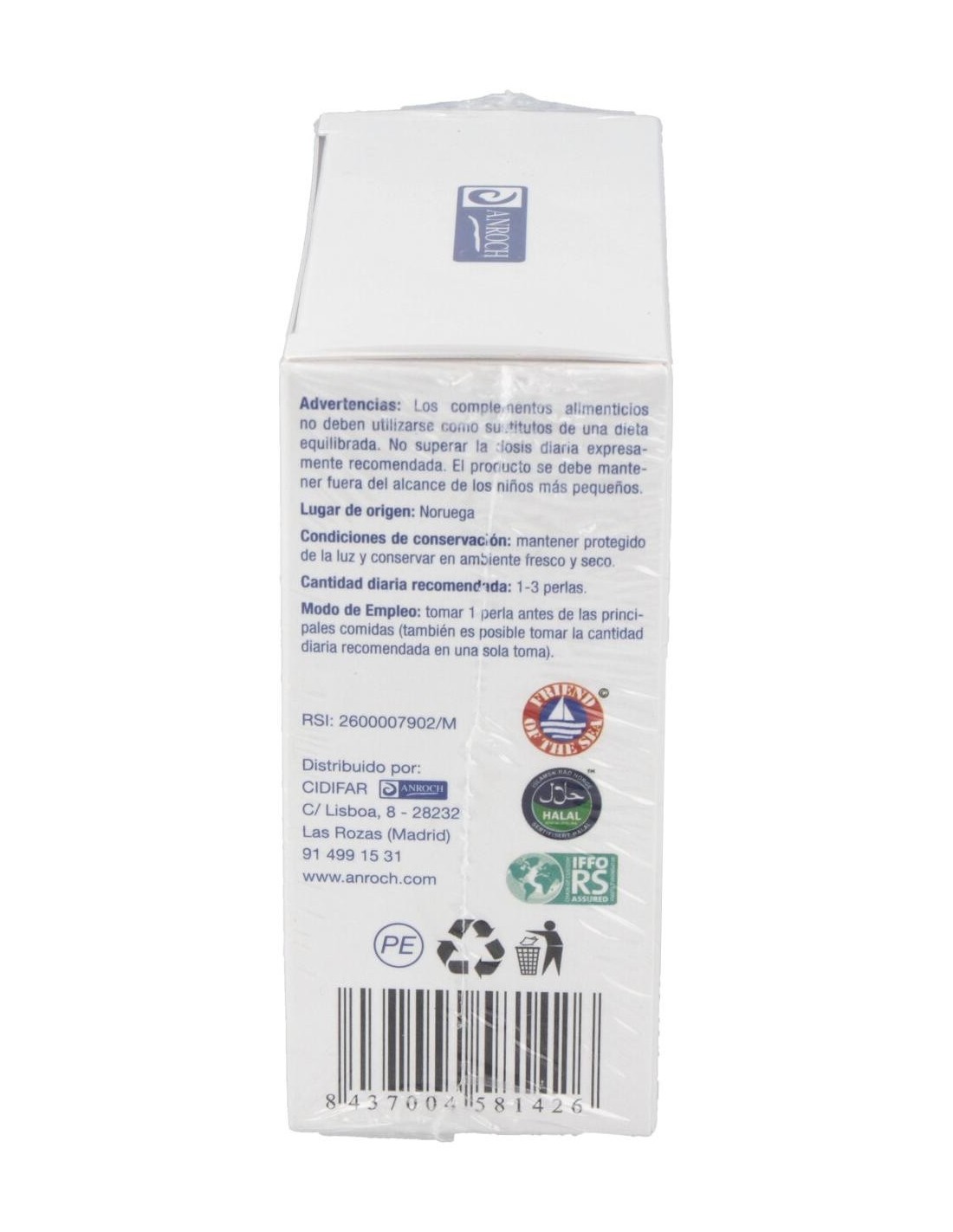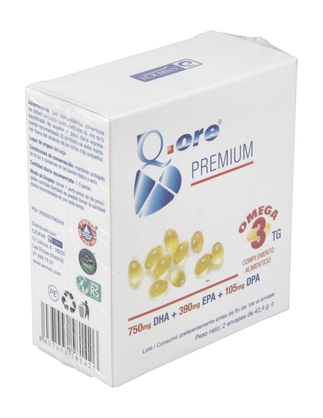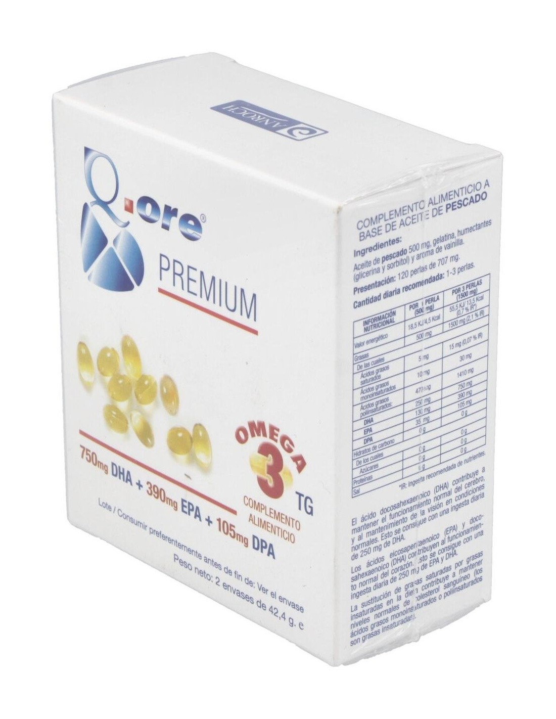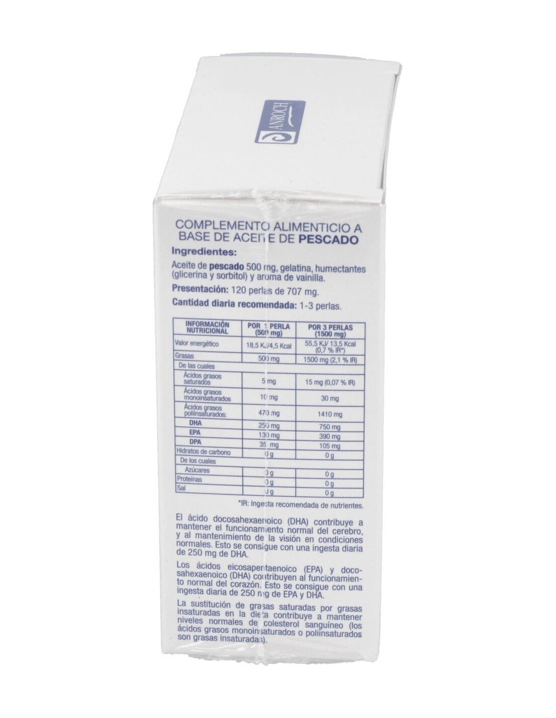 Complemento alimenticio a base de aceite de pescado en perlas para su facil deglución con un alto contenido en Omega 3 que contribuye al normal funcionamiento de la visión, el corazón y el cerebro, reduciendo los niveles de colesterol.