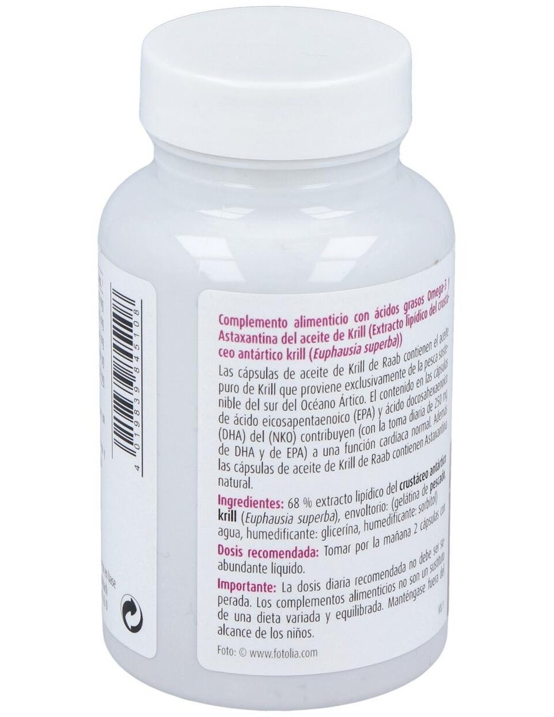 68% extracto lipídico del crustáceo antártico krill (Euphausia superba), envoltorio de la cápsula: (gelatina de pescado, humedificante: glicerina, humedificante: sorbitol)