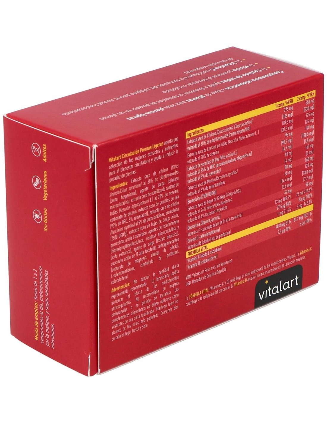 Ingredientes por 1 comprimido: Extracto seco de Cítricos (Citrus sinensis, Citrus aurantium) valorado al 60% de citroflavonoides (como hesperidina) 275 mg, Extracto seco de Castaño de Indias (Aesculus hippocastanum L) valorado al 20% de aescina 187,5 mg, Extracto de semillas de Uva (Vitis vinifera L.) valorado al 95% de OPC (proantocianidinas oligoméricas), valorado al 5% de resveratrol 95 mg, Extracto seco de Mirtilo (Vaccinium myrtillus) valorado al 5% de antocianidinas 80 mg, Bromelaína (2500 UGD/g) 80 mg, Extracto seco de hojas de Ginkgo (Ginkgo biloba) valorado al 24% heterósidos, valorado al 6% lactonas terpénicas 60 mg, Quercetina (de Sophora japonica extracto) 49 mg, Vitamina E (succinato ácido de D-alfa-tocoferilo) 13 mg 108,3%VRN, Selenio (L-seleniometionina) 27,5 mcg 50% VRN, Vitamina B6 (clorhidrato de piridoxina) 1 mg 71,4%VRN, Fórmula Vital (Vitamina C (ácido L-ascórbico) 40,8 mg 51%VRN, Vitamina D (colecalciferol) 2,5 mcg 50% VRN. VRN: Valores de Referencia de Nutrientes. UGD: Unidades de Gelatina Digerible.