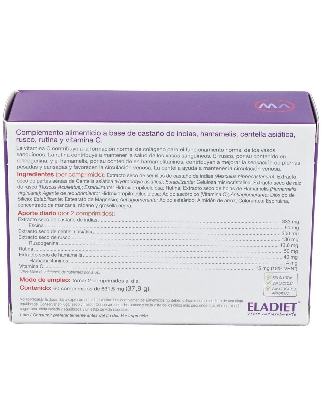 Extracto seco de semillas de castaños de Indias, extracto seco de partes aéreas de centellas asiática, celulosa microcristalina, extracto seco de raíz de rusco, hidroxipropilcelulosa, rutina, extracto seco de hojas de hamamelis, hidroxipropilmetilcelulosa, ácido ascórbico (vitamina C), dióxido de silicio, estearato de magnesio, ácido esteárico, almidón de arroz, colorantes: espirulina, concentrado de manzana, rábano, grosella negra.