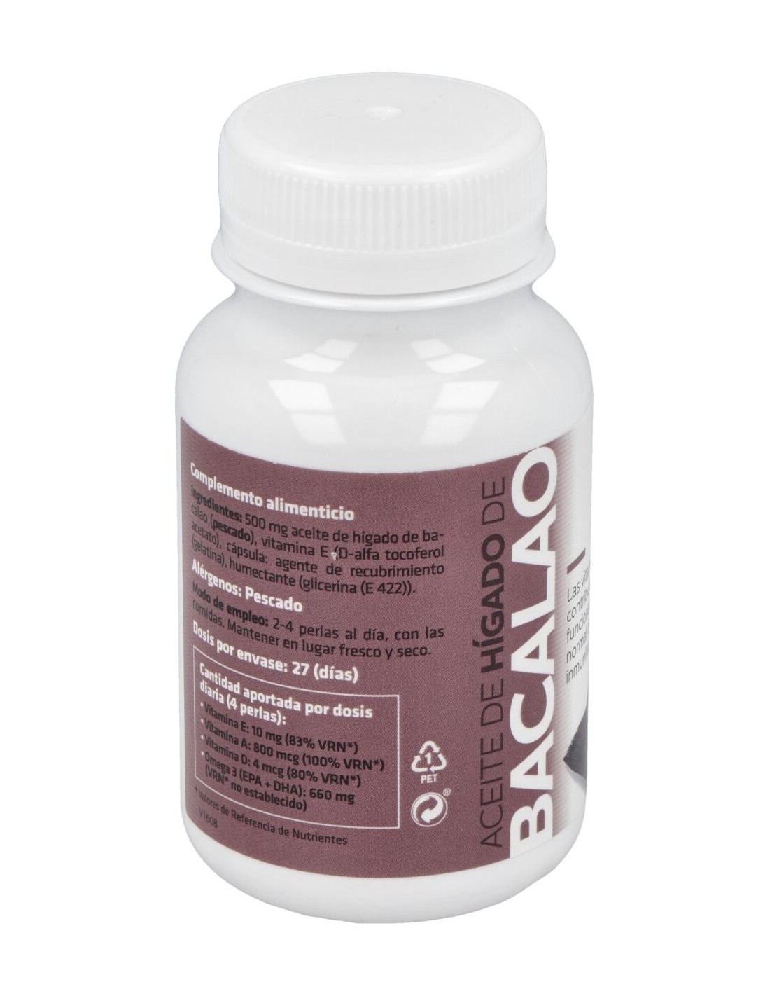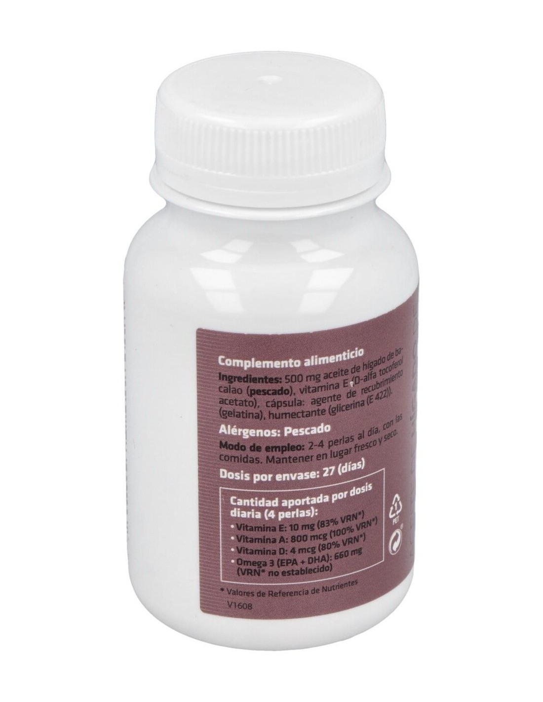 Aceite hígado de bacalao 550mg con un contenido mínimo de EPA y DHA de 165mg, vitamina A 200mcg, vitamina D 1,0mcg y vitamina E 2mg. Perla de gelatina y glicerina.