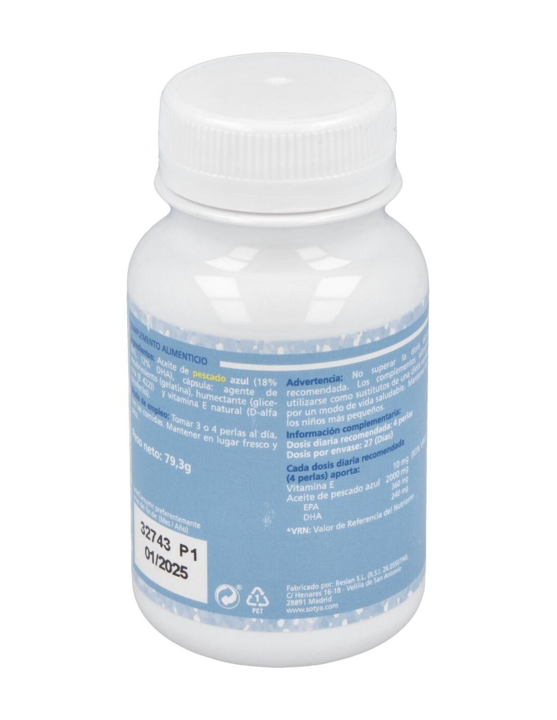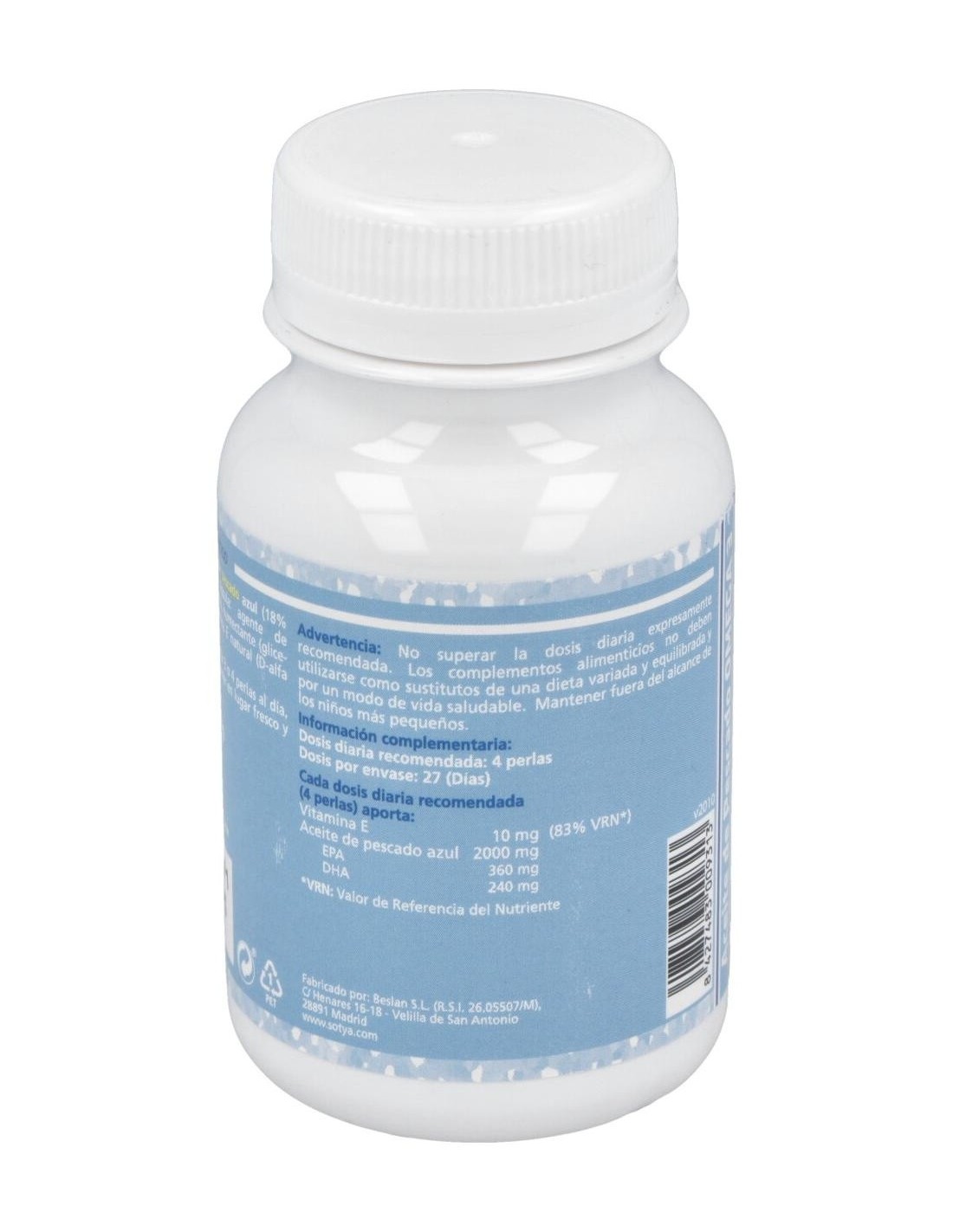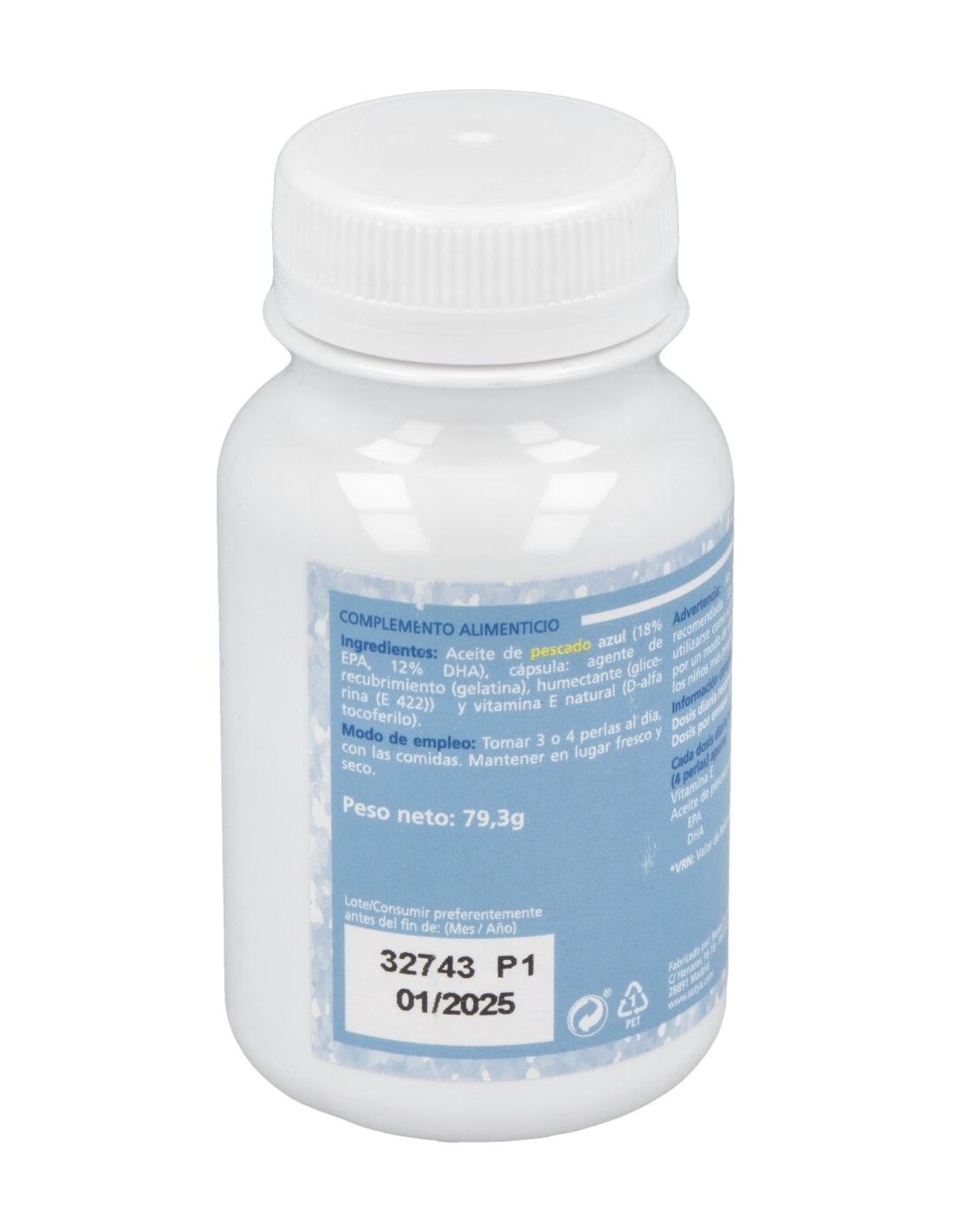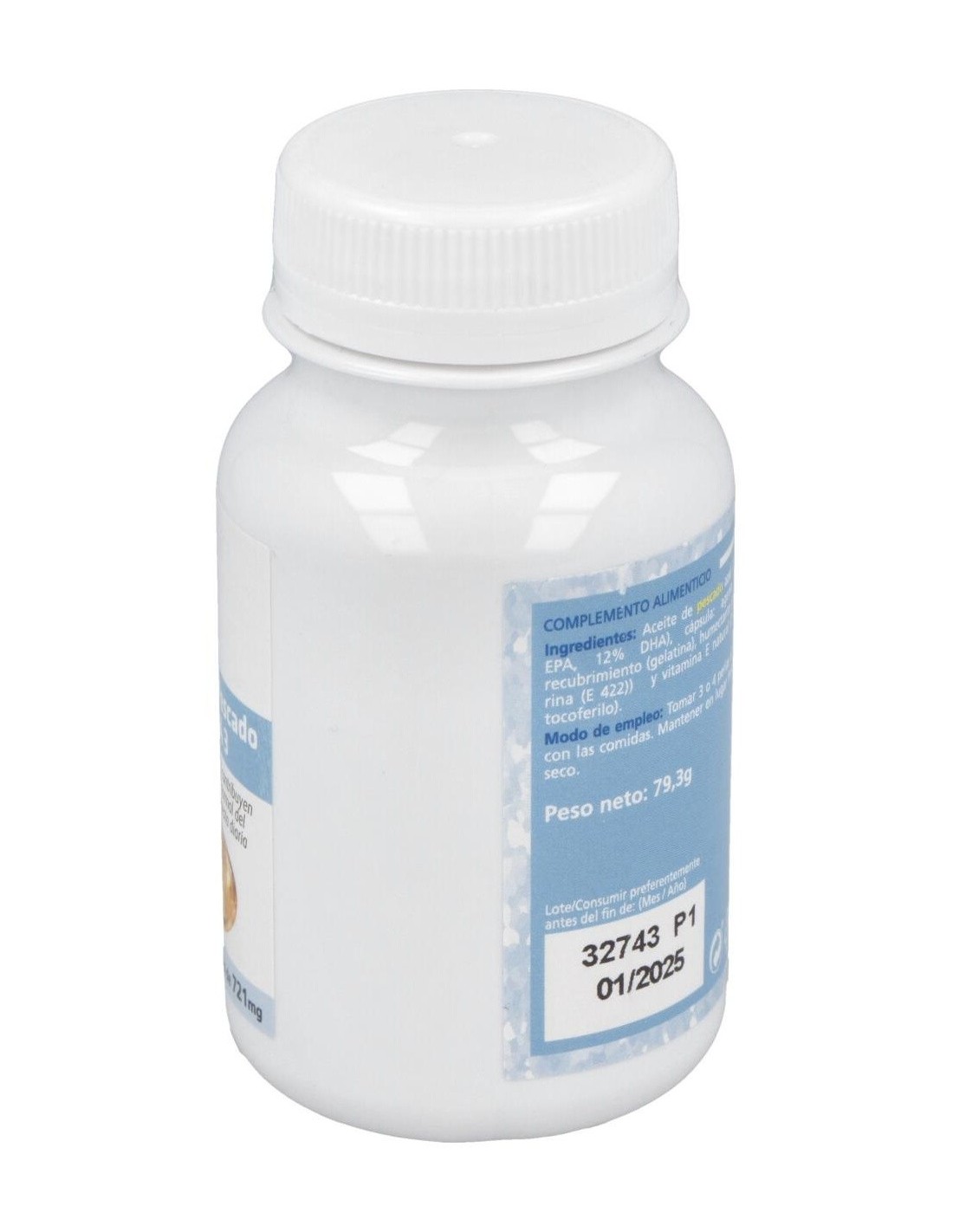 500mg de aceite de pescado (18% EPA y 12% DHA) y 3mg de vitamina E natural (d,alfa-tocoferol acetato, 33% CDR). Cobertura de gelatina y glicerina.