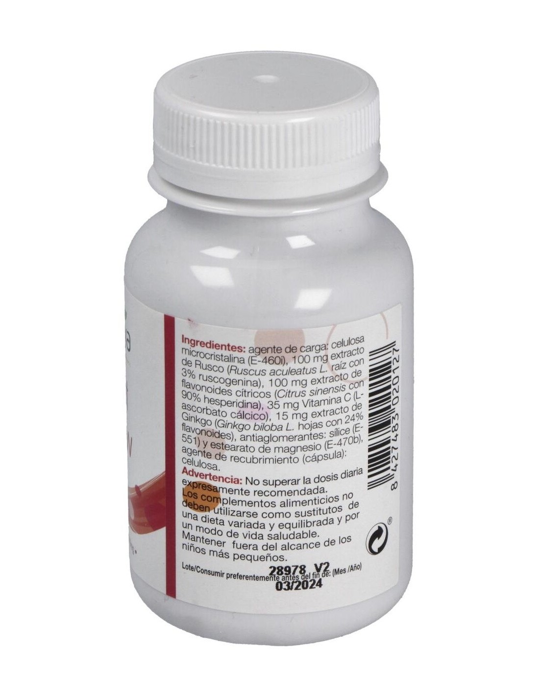 Agente de carga celulosa microcristalina-microcrystalline cellulose, Ruscus aculeatus L. extra. 200 mg, ruscogin, Citrus sinensis L.ext -200 mg, 90 mg, hesperidine, Vit C acido L-ascorbato calcico, 70 mg, Ginkgo biloba L.extr. 30 mg, antiaglomerantes, magnesium sterarate dioxido de silice.