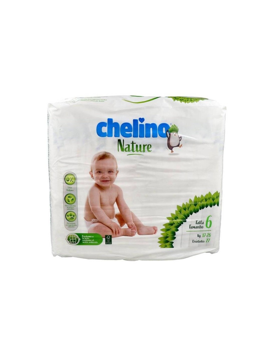 Se trata de unos pañales dermoprotectores que incorporan unas bandas con una loción hidratante. Está elaborada con ingredientes naturales que contribuye a mantener la piel del bebé sana y nutrida. Entre los componentes están la grosella negra, el extracto de ambiaty y aloe vera. Han sido testados clínicamente bajo control dermatológico. La composición de los pañales permite mantener al bebé seco durante 12 horas. Están diseñados anatómicamente con el sistema Accodion Strecht de alas elásticas que facilitan los movimientos del bebé sin ocasionarle dificultades. Chelino ha fabricado unos pañales que cuidan el medio ambiente. La celulosa procede de bosques gestionados responsablemente y poseen certificado FSC. La energía utilizada en el proceso de fabricación procede de fuentes sostenibles. Para los envases, tanto las bolsas como las cajas, se han utilizado materiales reciclados.