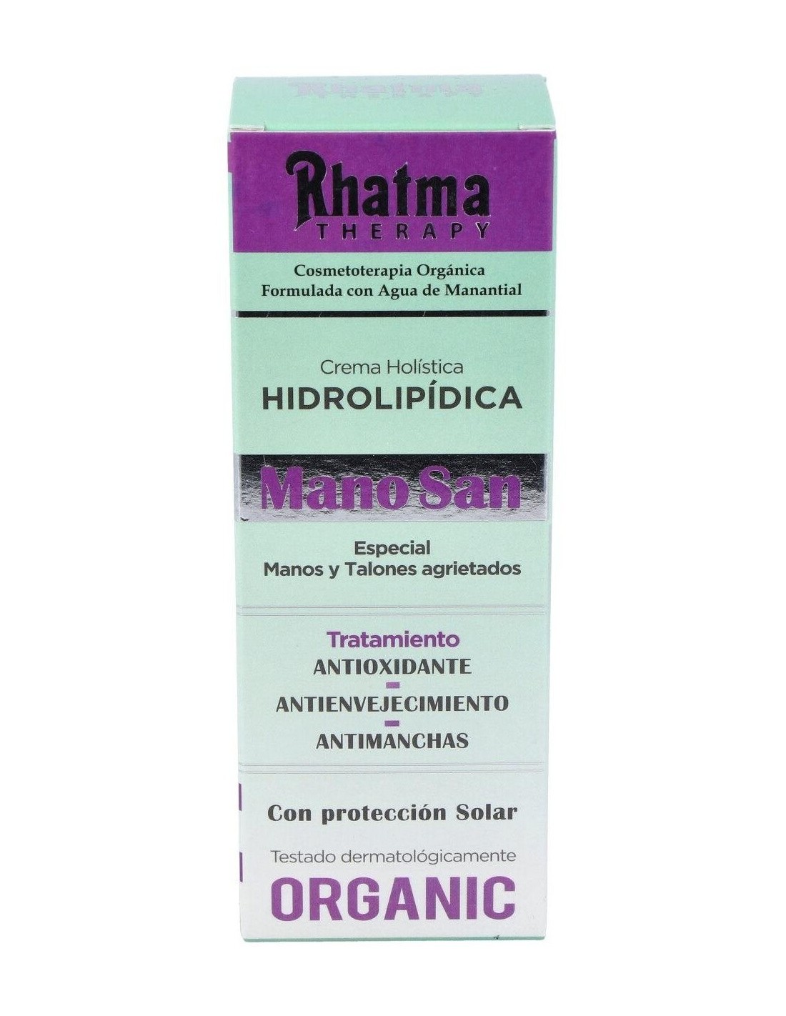 Rhatma Mano San crema para manos secas y sensibles es una suave loción perfecta para reparar las manos dañadas y extremadamente sensibles. Es un tratamiento óptimo para regenerar la cutícula, al mismo tiempo que endureza las uñas.