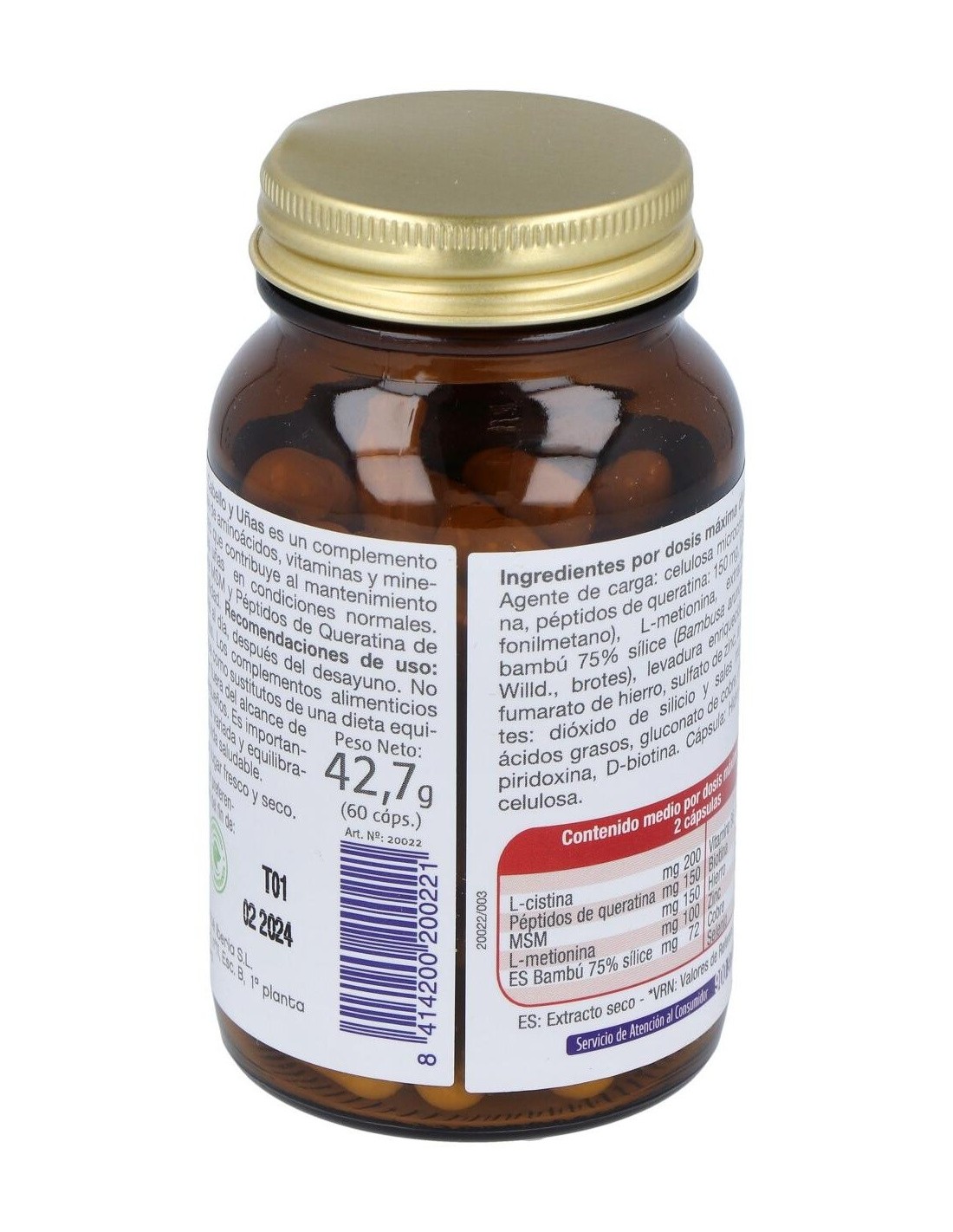 L-cistina (150 mg), Dióxido de Silicio, Sílice, Sulfato de Zinc, Gluconato de Cobre, Celulosa microcristalina, Extracto seco de bambú, Levadura de selenio, Fumarato de hierro, L-Metionina, Clorhidrato de piridoxina, D-biotina, Sales magnésicas de ácidos grasos, Péptidos de queratina, MSM.