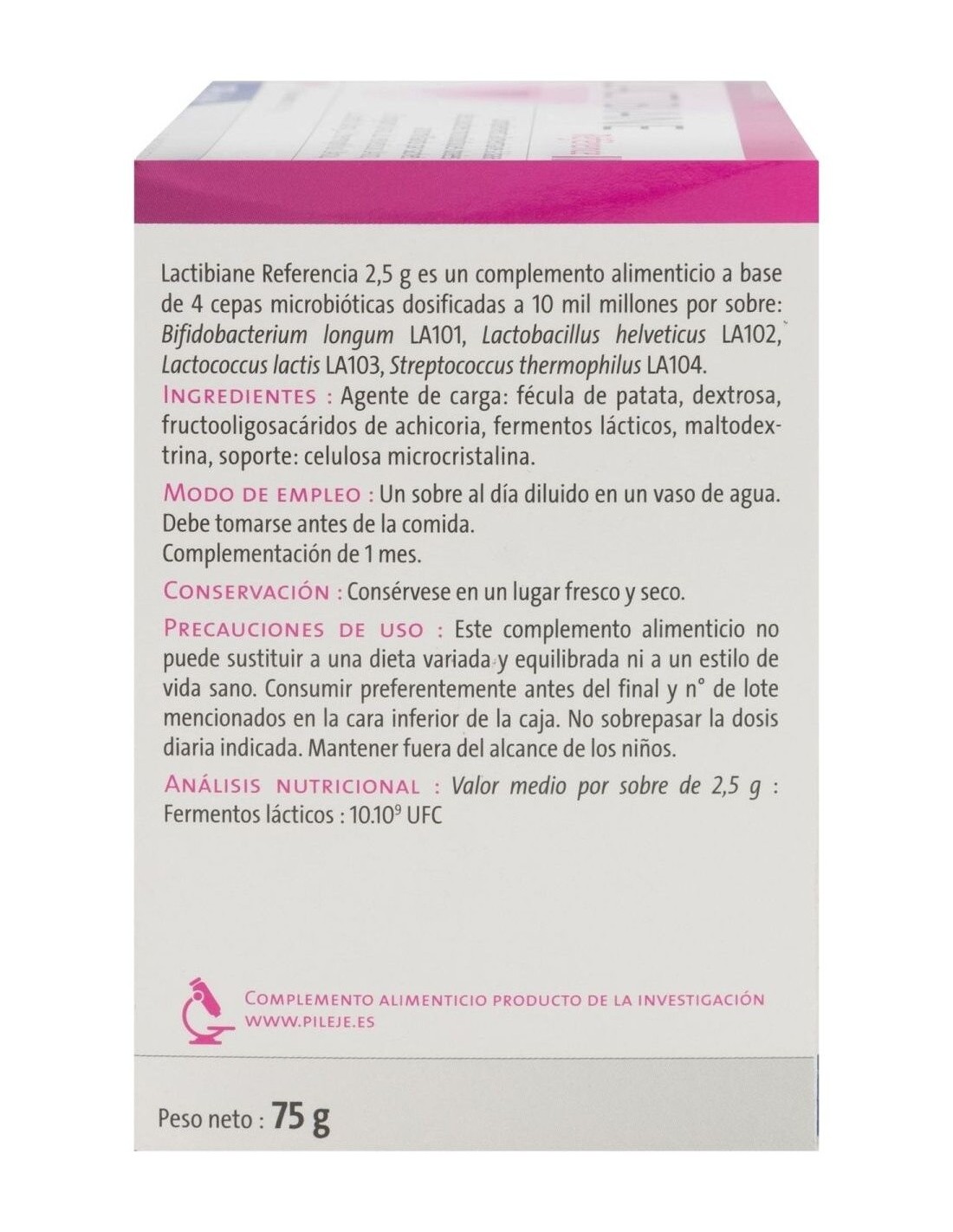Mezcla de 4 cepas probióticas rigurosamente seleccionadas. Las cepas probióticos de Lactibiane Référence están certificadas GRAS (Generally Regardes As Safe).