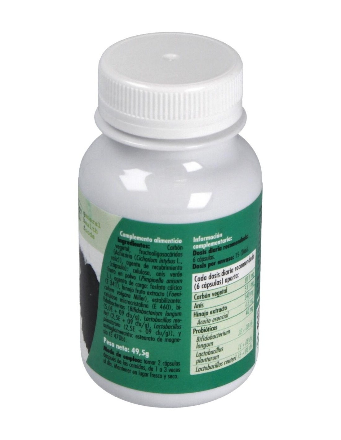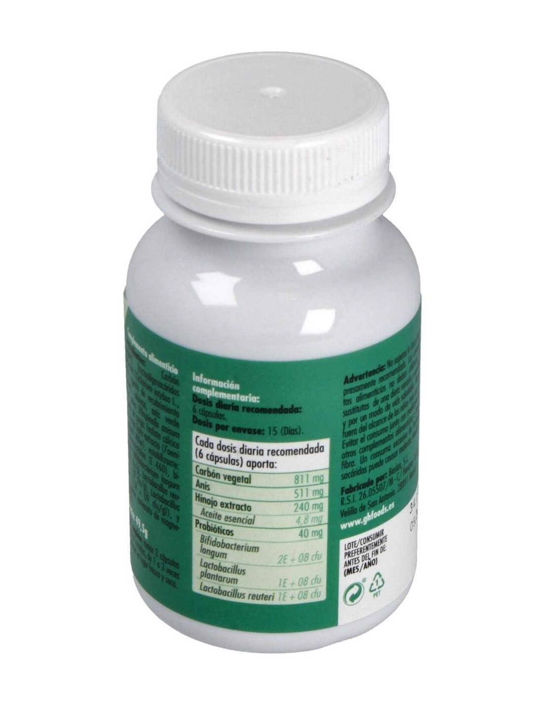 Carbón vegetal medicinal (135 mg), fructooligosacáridos (110 mg), anís liofilizado en polvo - Foinicum vulgare miller (40 mg), Lactobacillus acidophilus (7,5 mg con 100 millones de células vivas/g) Como excipientes, fosfato cálcico, celulosa microcristalina y estearato de magnesio