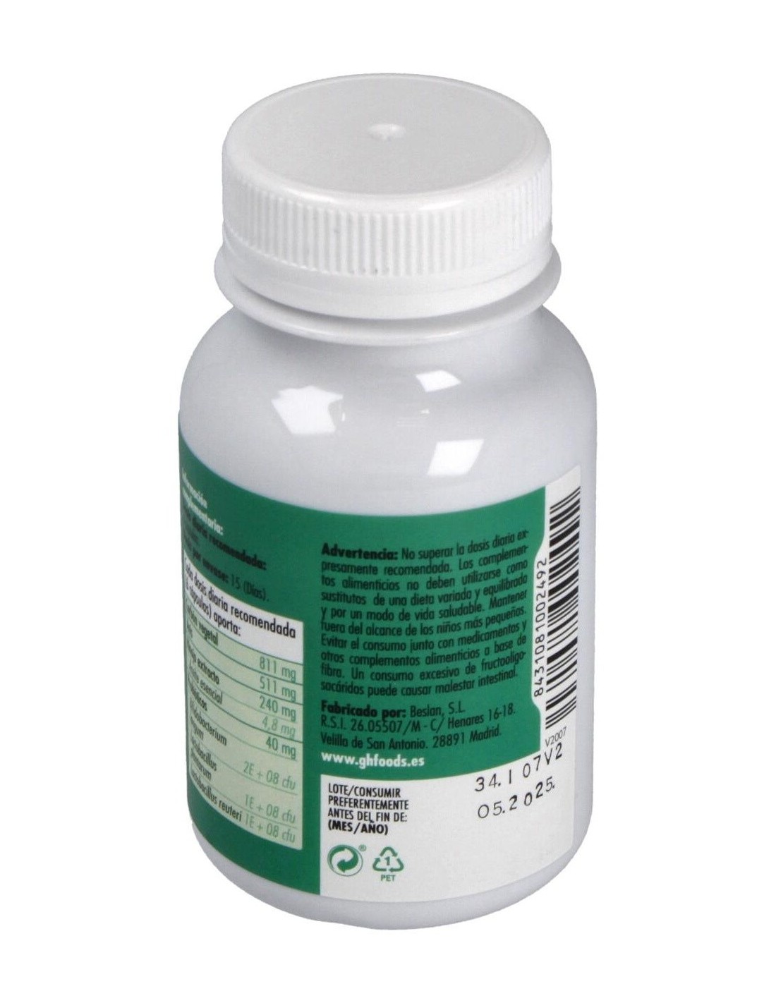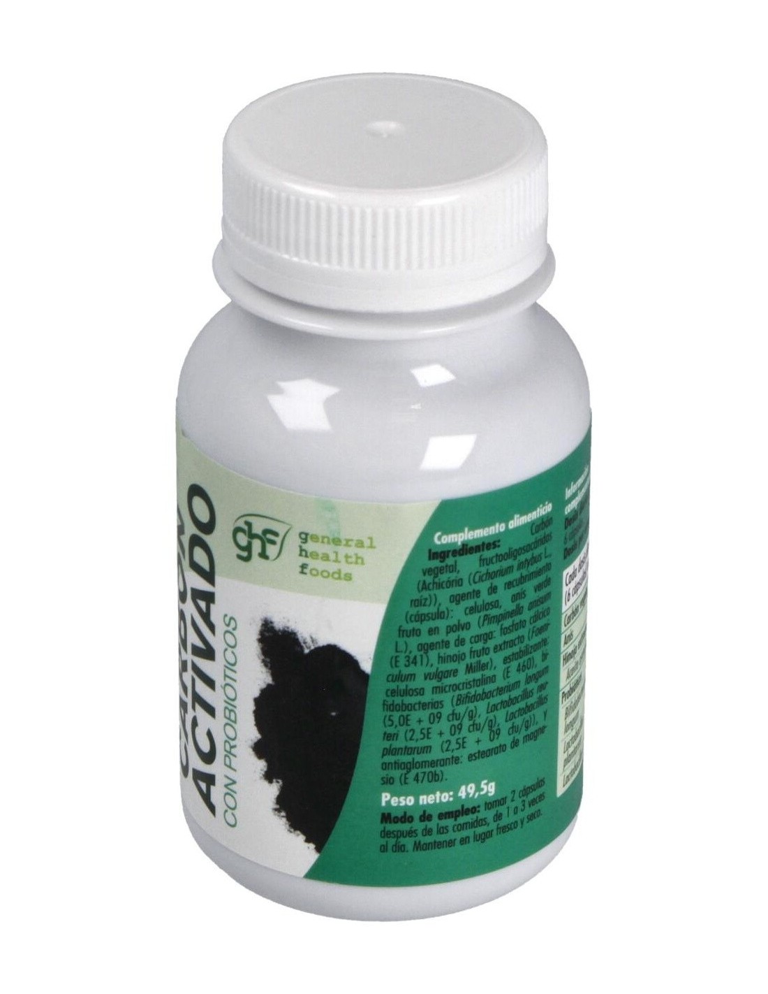 GHF Carbón Vegetal Probiótico 550mg son unas cápsulas ideales para mejorar tu tránsito intestinal y depurar tu organismo de toxinas perjudiciales. La fórmula de este producto ha sido enriquecida con bifidobacterias o probióticos """"buenos"""" que colonizarán tu intestino y así mantendrán en buen estado la salud de tu estómago.