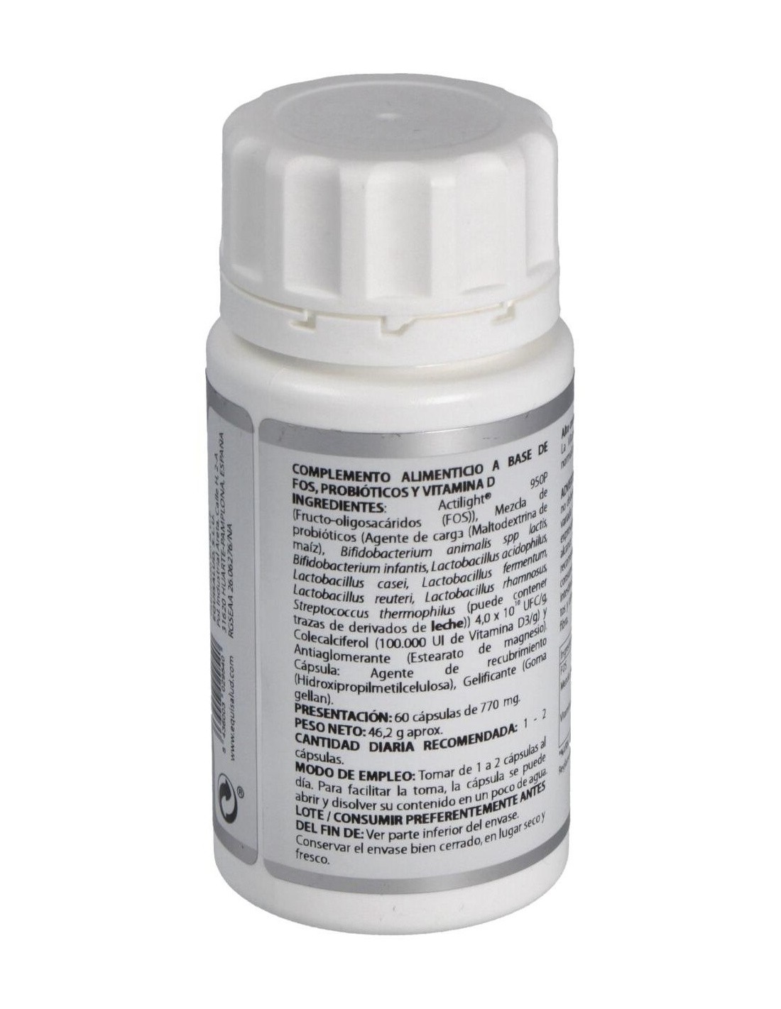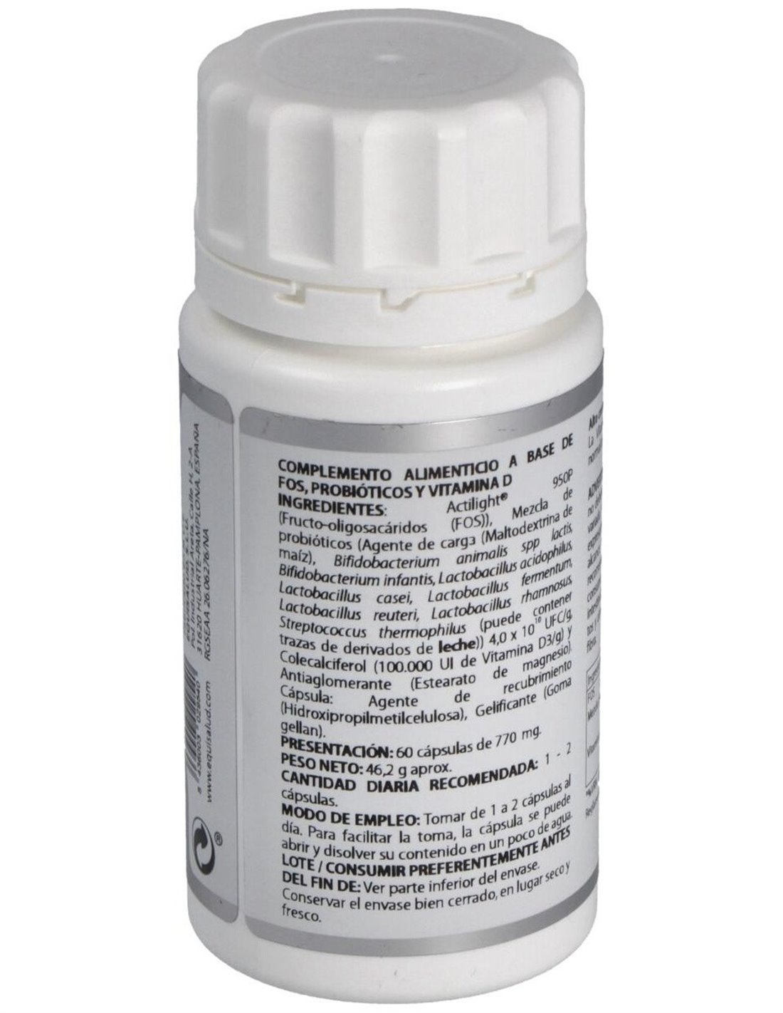 ACTILIGHT® 950P (FRUCTO-OLIGOSACÁRIDOS (FOS)), 545 MG; MEZCLA DE PROBIÓTICOS (MALTODEXTRINA DE MAÍZ (AGENTE DE CARGA), BIFIDOBACTERIUM ANIMALIS SPP LACTIS, BIFIDOBACTERIUM INFANTIS, LACTOBACILLUS ACIDOPHILUS, LACTOBACILLUS CASEI, LACTOBACILLUS FERMENTUM, LACTOBACILLUS REUTERI, LACTOBACILLUS RHAMNOSUS, STREPTOCOCCUS THERMOPHILUS) 4,0X1010 UFC/G, 100 MG; COLECALCIFEROL (>100.000 UI DE VITAMINA D3/G), 2 MG. EXCIPIENTE TECNOLÓGICO: ESTEARATO DE MAGNESIO (ANTIAGLOMERANTE), C.S. Envoltura: AGENTE DE RECUBRIMIENTO (HIDROXIPROPILMETILCELULOSA) Y GELIFICANTE (GOMA GELLAN).