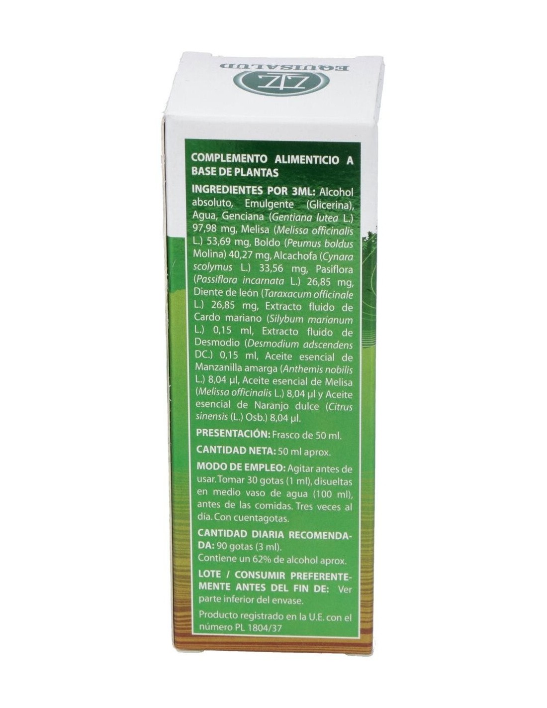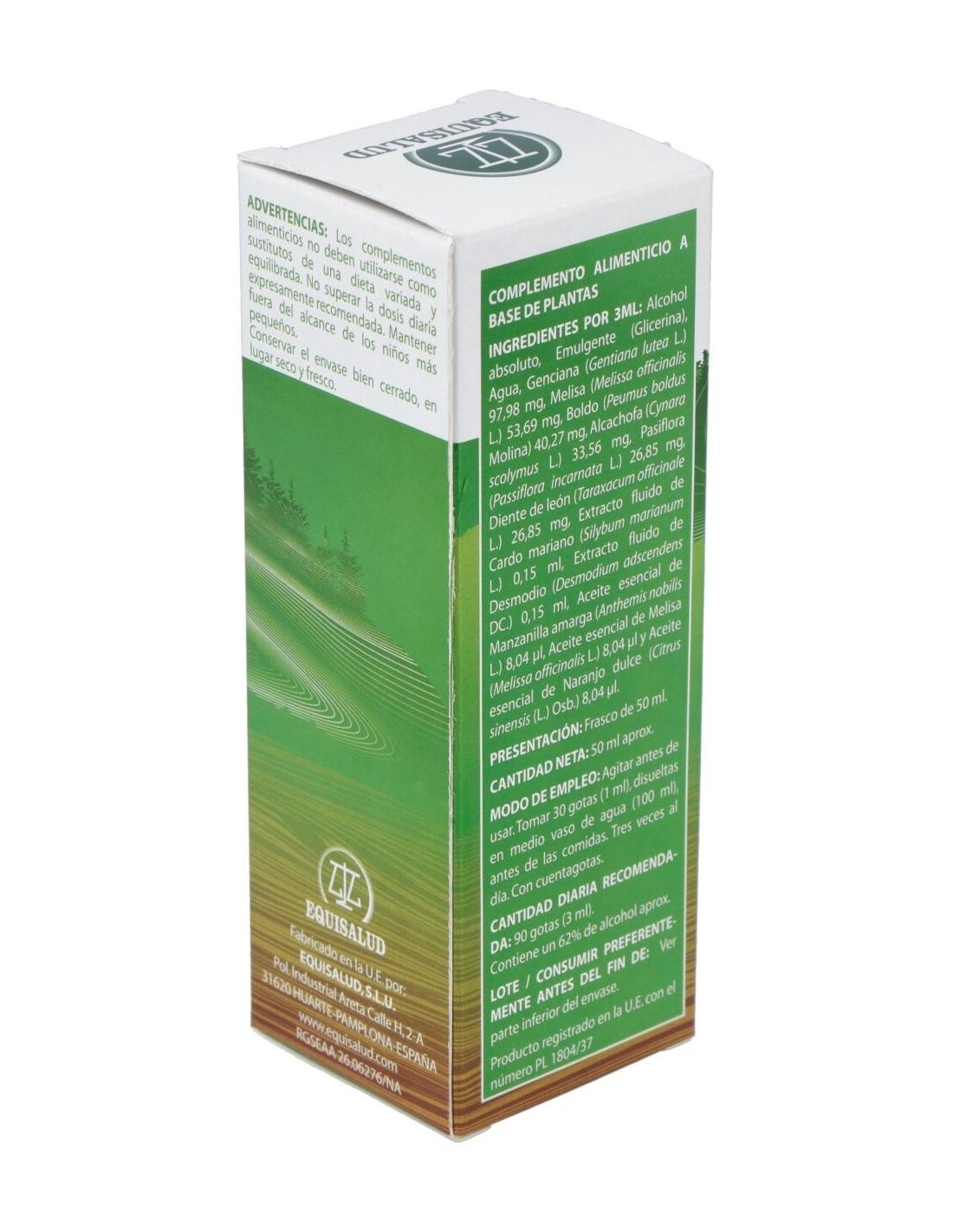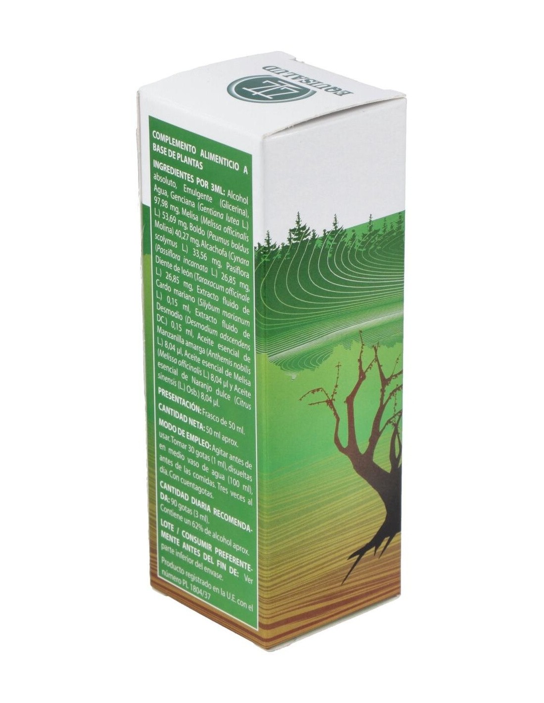 Genciana (Gentiana lutea L.) 97,98 mg: melisa (Melissa officinalis L.) 53,69 mg: boldo (Peumus boldus Molina) 40,27 mg: alcachofa (Cynara scolymus L.) 33,56 mg: pasiflora (Passiflora incarnata L.) 26,85 mg: diente de león (Taraxacum officinale L.) 26,85 mg: extracto fluido de cardo mariano (Silybum marianum L.) 0,15 ml: extracto fluido de desmodio (Desmodium adscendens DC.) 0,15 ml: aceite esencial de manzanilla amarga (Anthemis nobilis L.) 8,04 µl: aceite esencial de melisa (Melissa officinalis L.) 8,04 µl y aceite esencial de naranjo dulce (Citrus sinensis (L.) Osb.) 8,04 µl. Diluyentes: alcohol absoluto, glicerina y agua purificada.