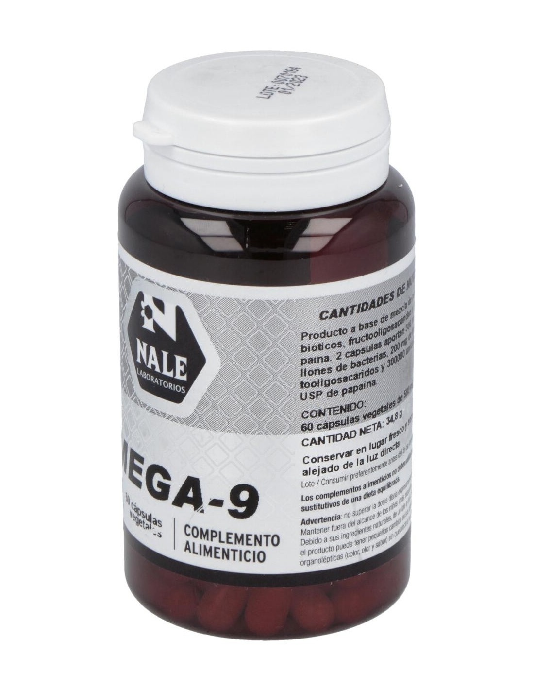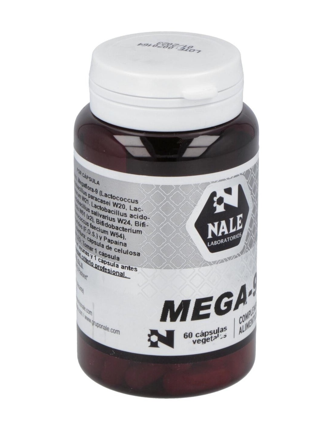 Megaflora-9 (Lactococcus lactis W19,Lactobacillus paracasei W20, Lactobacillus plantarum W21, Lactobacillus acidophilus W22,Lactobacillus salivarius W24, Bifidobacterium lactis W51 (x2), Bifidobacterium lactis W52, Enterococcus faecium W54), almidón de maíz, Fructooligosacáridos (F.O.S.) y Papaína. Cobertura: cápsula de celulosa.