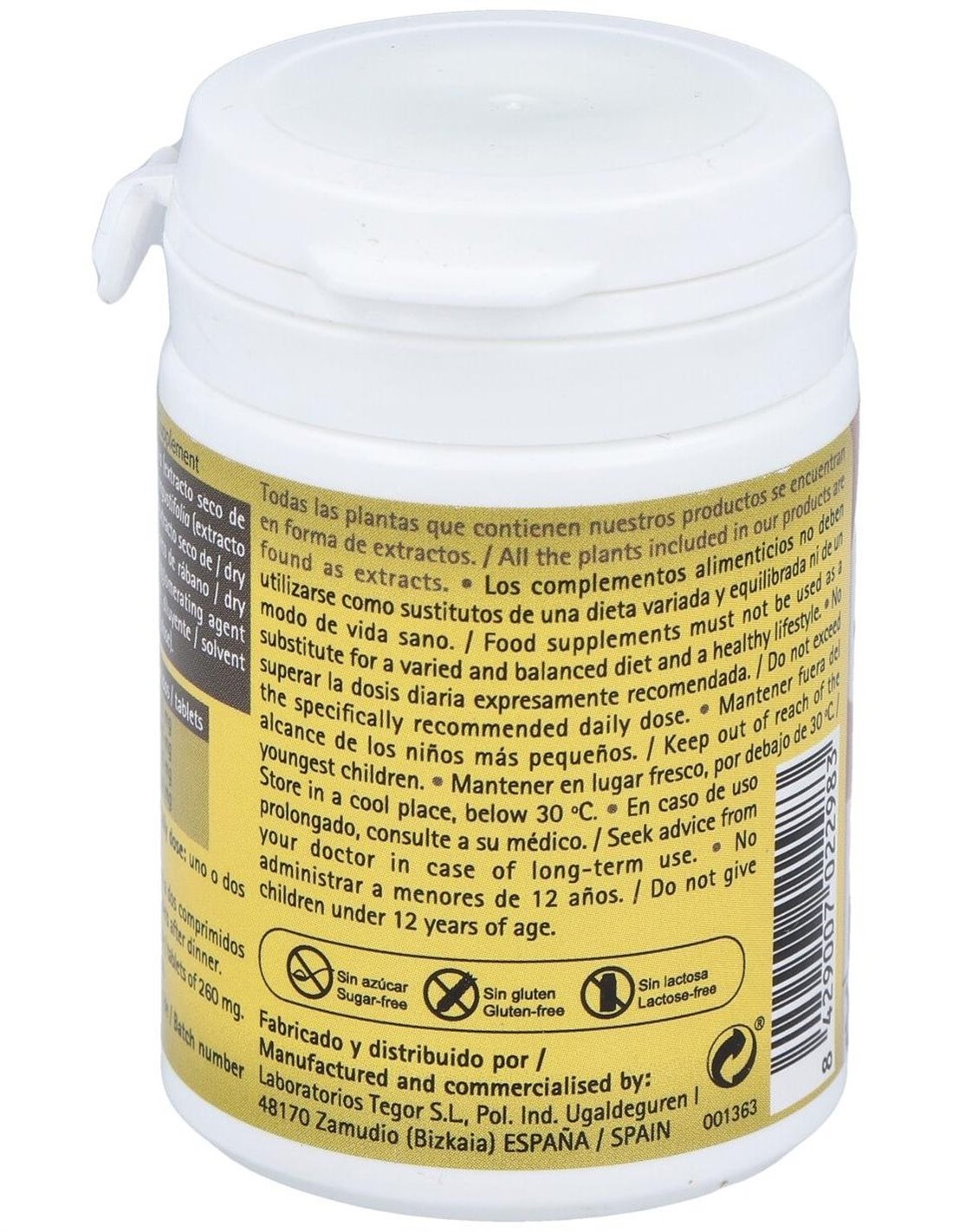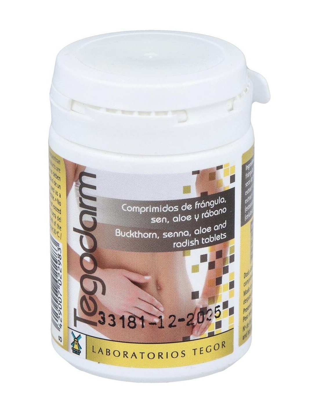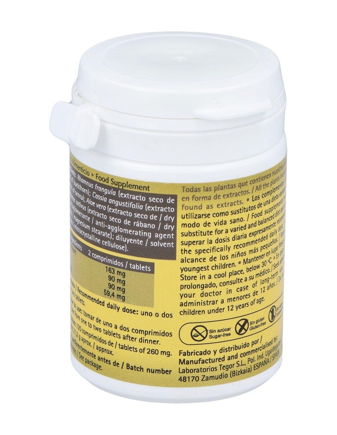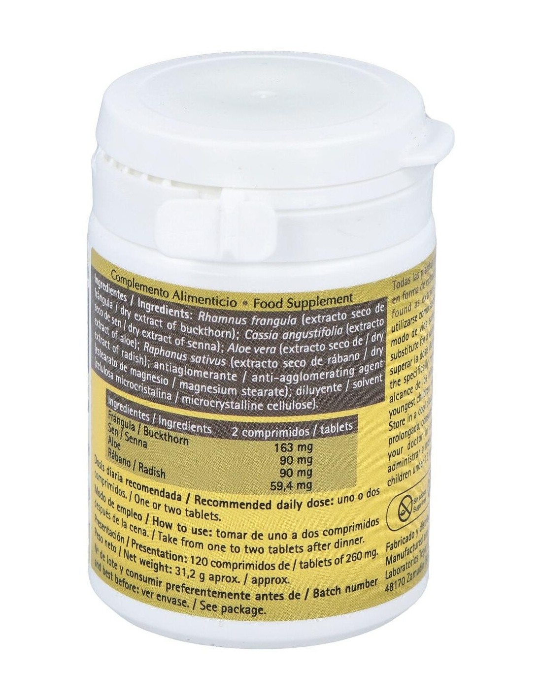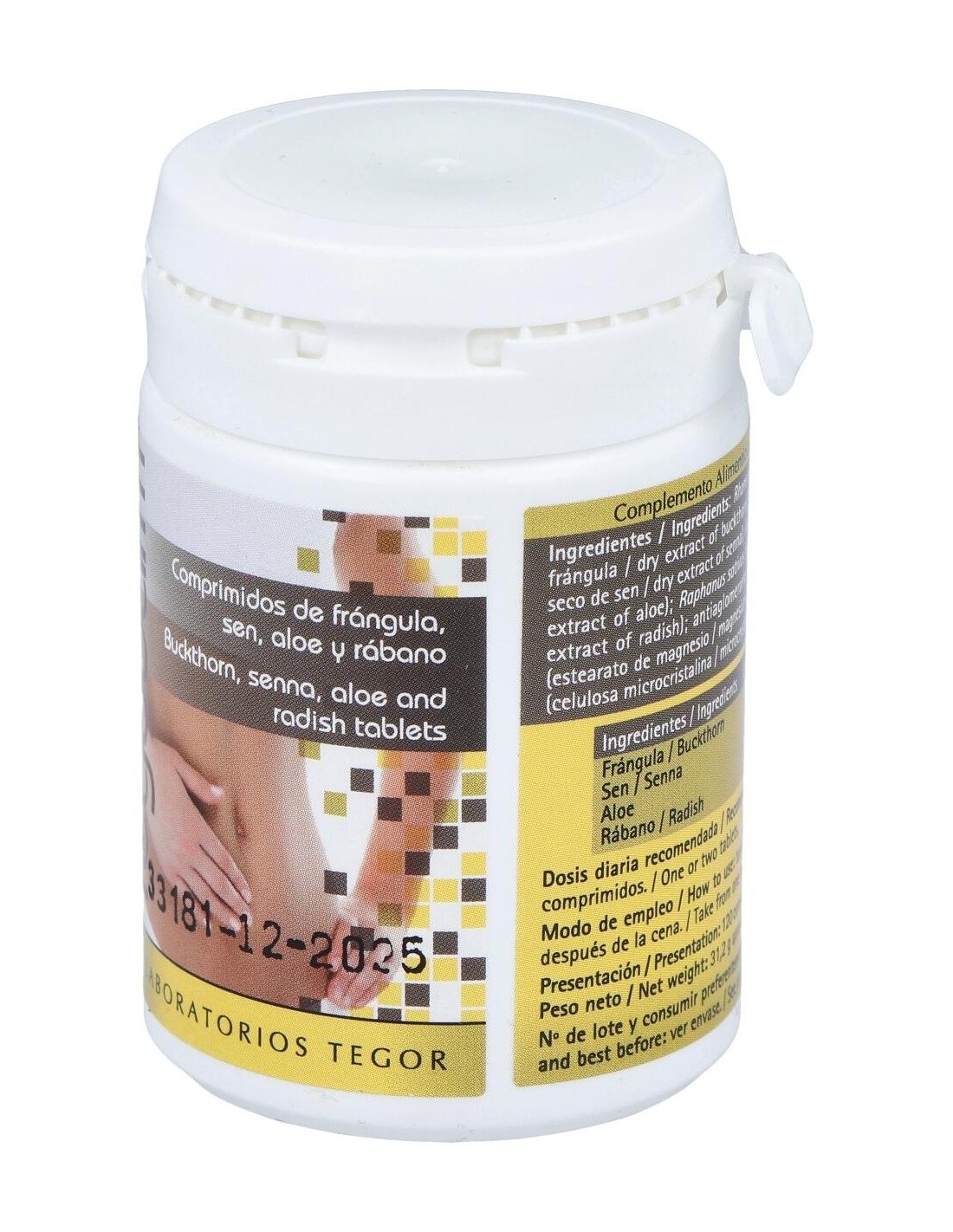 Rhamnus frangula (corteza de frángula), 81,50 mg: Cassia angustifolia (hojas de sen), 45 mg: Aloe barbadensis (aloe), 45 mg: Rhaphanus sativus (raíz de rábano), 29,70 mg: excipientes, c.s.p.