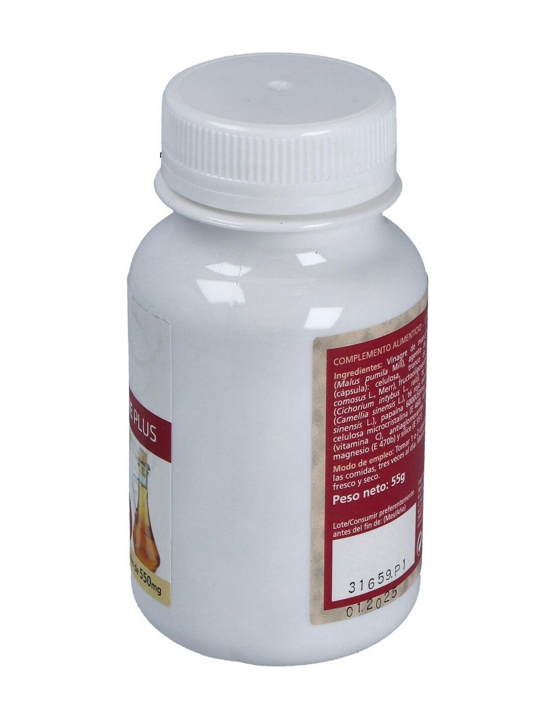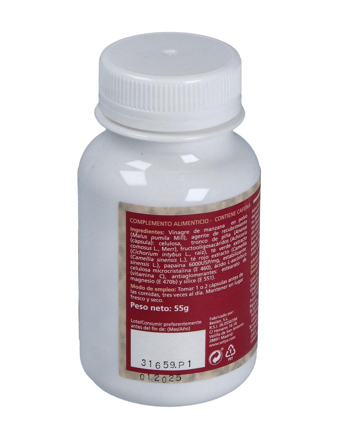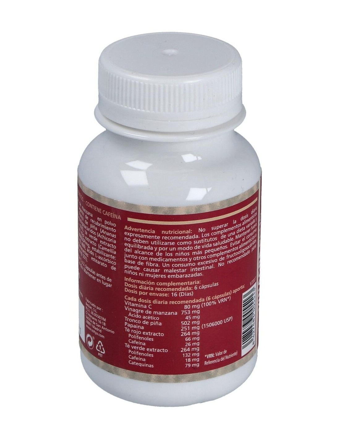 100 cápsulas vegetales de 550mg, con vinagre de manzana (140mg), corazón de piña (100mg), té rojo extracto 30% de polifenoles (30mg) equivalente a 100mg de planta, papaya (100mg), vitamina C (10mg, 17% CDR) y excipientes. Cápsula vegetal.
