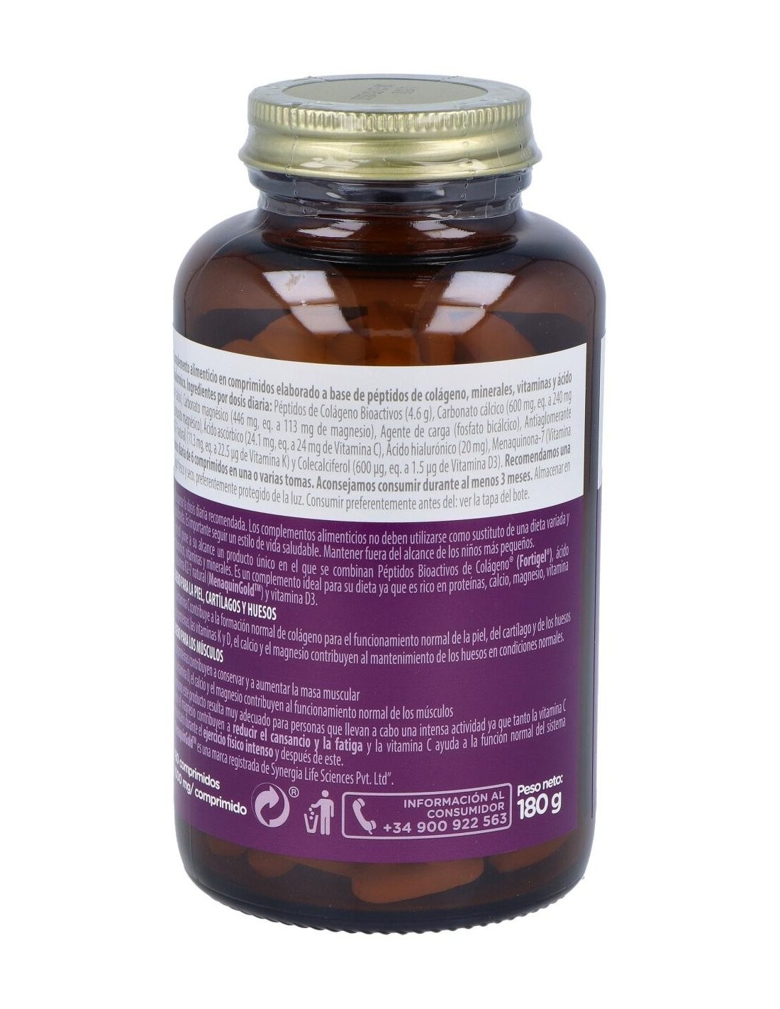 PÉPTIDOS DE COLÁGENO BIOACTIVOS (4,6G), CARBONATO CÁLCICO (600 MG, EQ. A 240 MG DE CALCIO), CARBONATO MAGNÉSICO (446 MG, EQ. A 113 MG DE MAGNESIO), ANTIALOMERANTES (FOSFATO BICÁLCIOCO Y ESTEARATO MAGNÉSICO), ÁCIDO ASCÓRBICO (24.1MG EQ: A 24 MG DE VITAMINA C),ÁCIDO HIALURÓNICO (20 MG), MENAQUINONA-7 (VITAMINAK2-7 NATURAL-MENAQUINOGOLD)(11.3 MG, EQ A 22.5µG DE VITAMINA K) Y COLECALCIFEROL (600µG, EQ A 1.5µG DE VITAMINA D3).