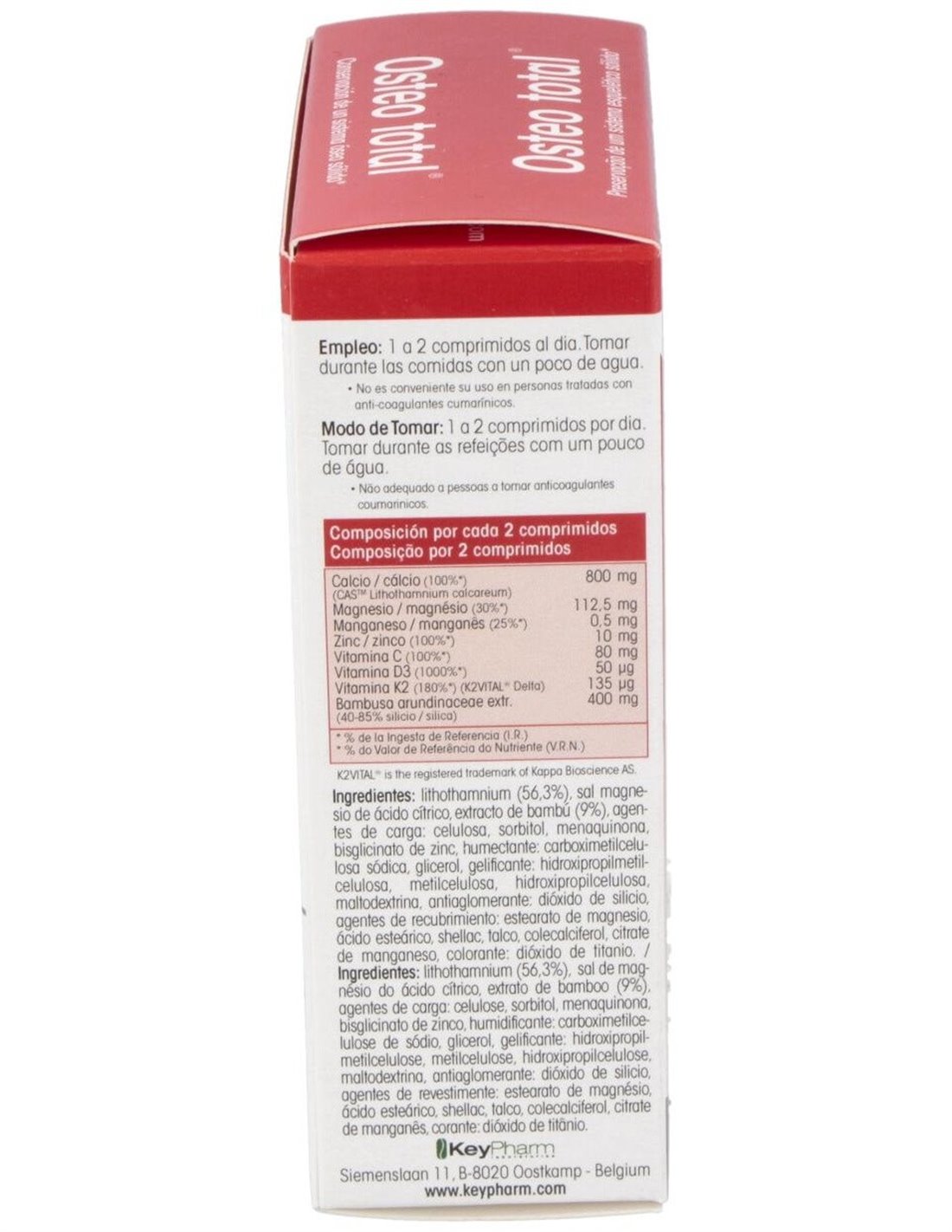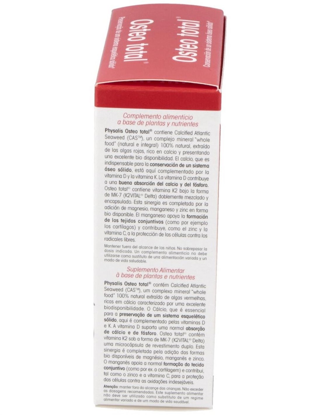 Contiene Calcified Atlantic Seaweed (CASTM), un complejo mineral whole food (natural e integral) 100% natural, extraído de las algas rojas, rico en calcio y presentando una excelente bio disponibilidad. El calcio, que es indispensable para la conservación de un sistema óseo sólido, está aquí complementado por la vitamina D y la vitamina K. La vitamina D contribuye a una buena absorción del calcio y del fósforo. Osteo total® contiene vitamina K2 bajo la forma de MK-7 (K2VITAL® Delta) doblemente mezclado y encapsulado. Esta sinergia es completada por la adición de magnesio, manganeso y zinc en forma bio disponible. El manganeso apoya la formación de los tejidos conjuntivos (como por ejemplo los cartílagos) y contribuye, como el zinc y la vitamina C, a la protección de las células contra los radicales libres.