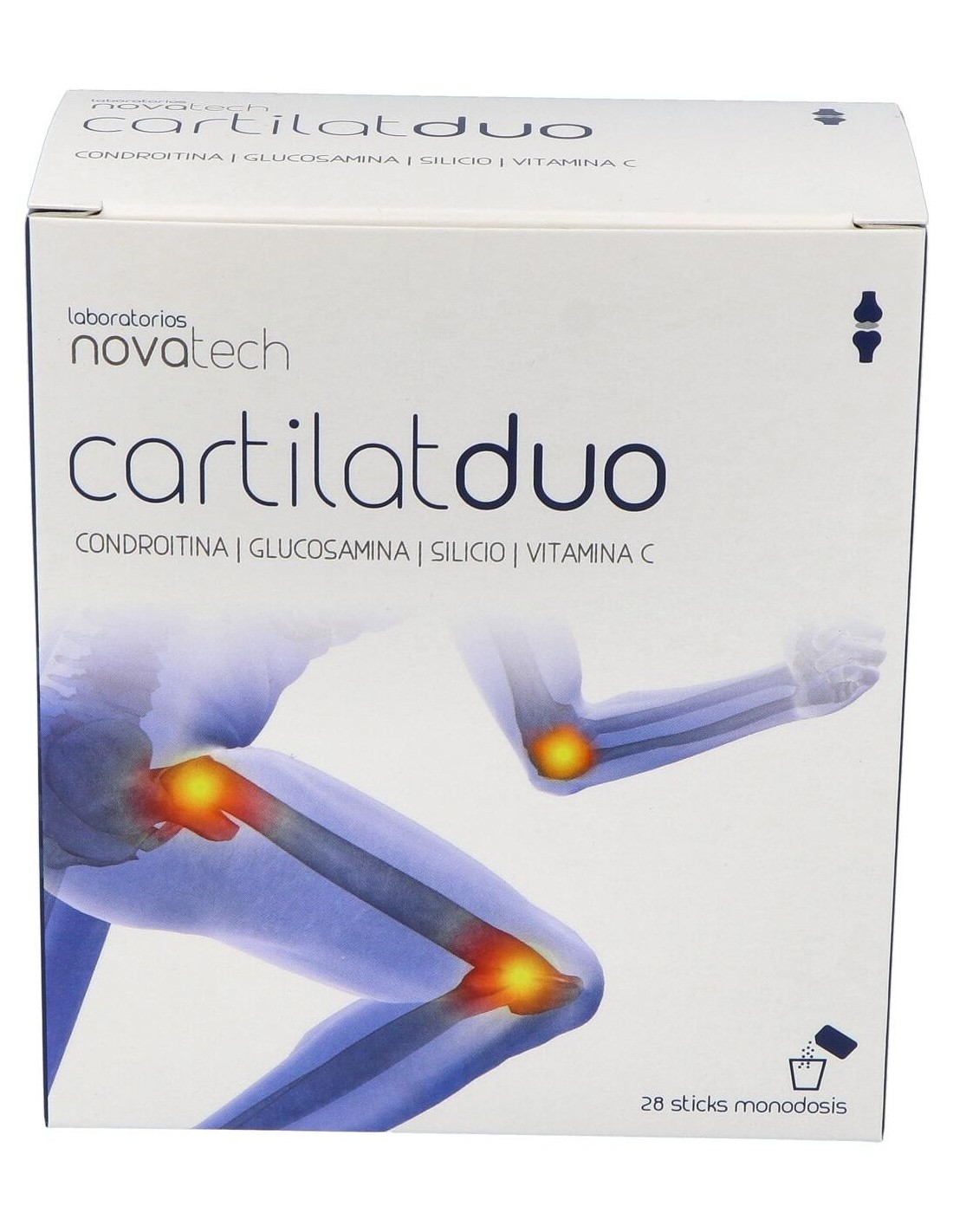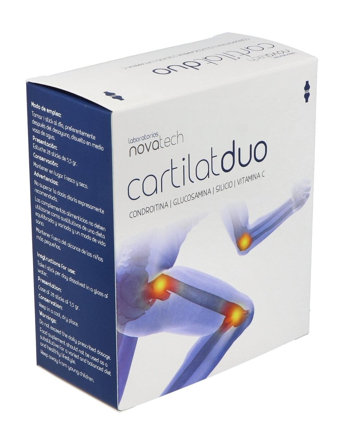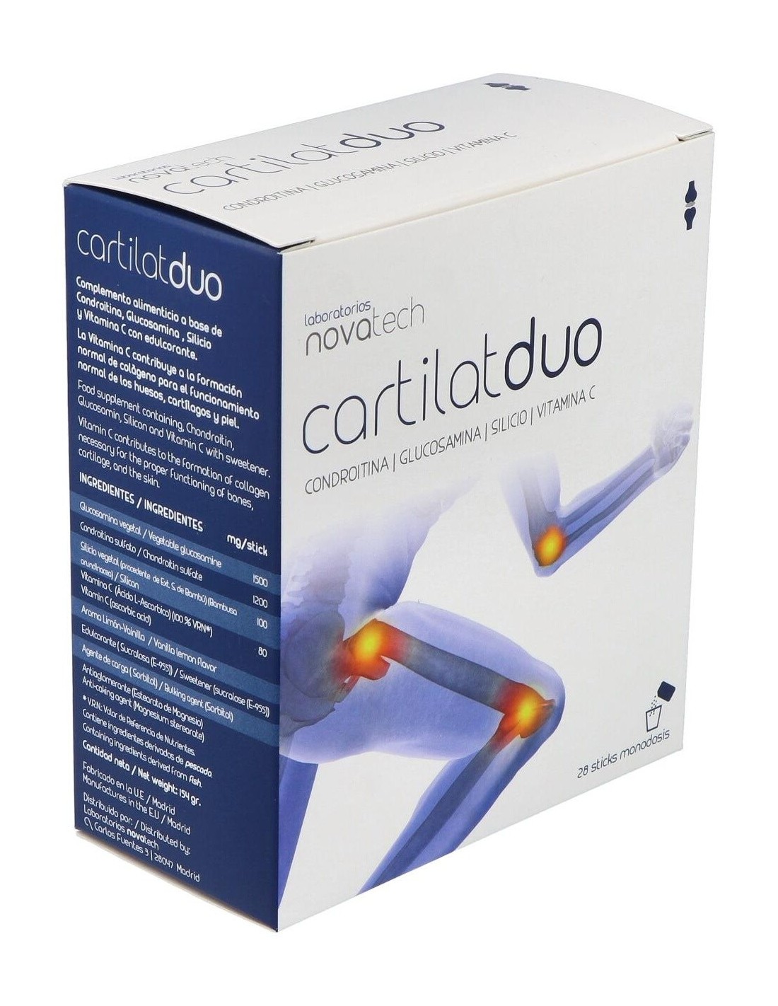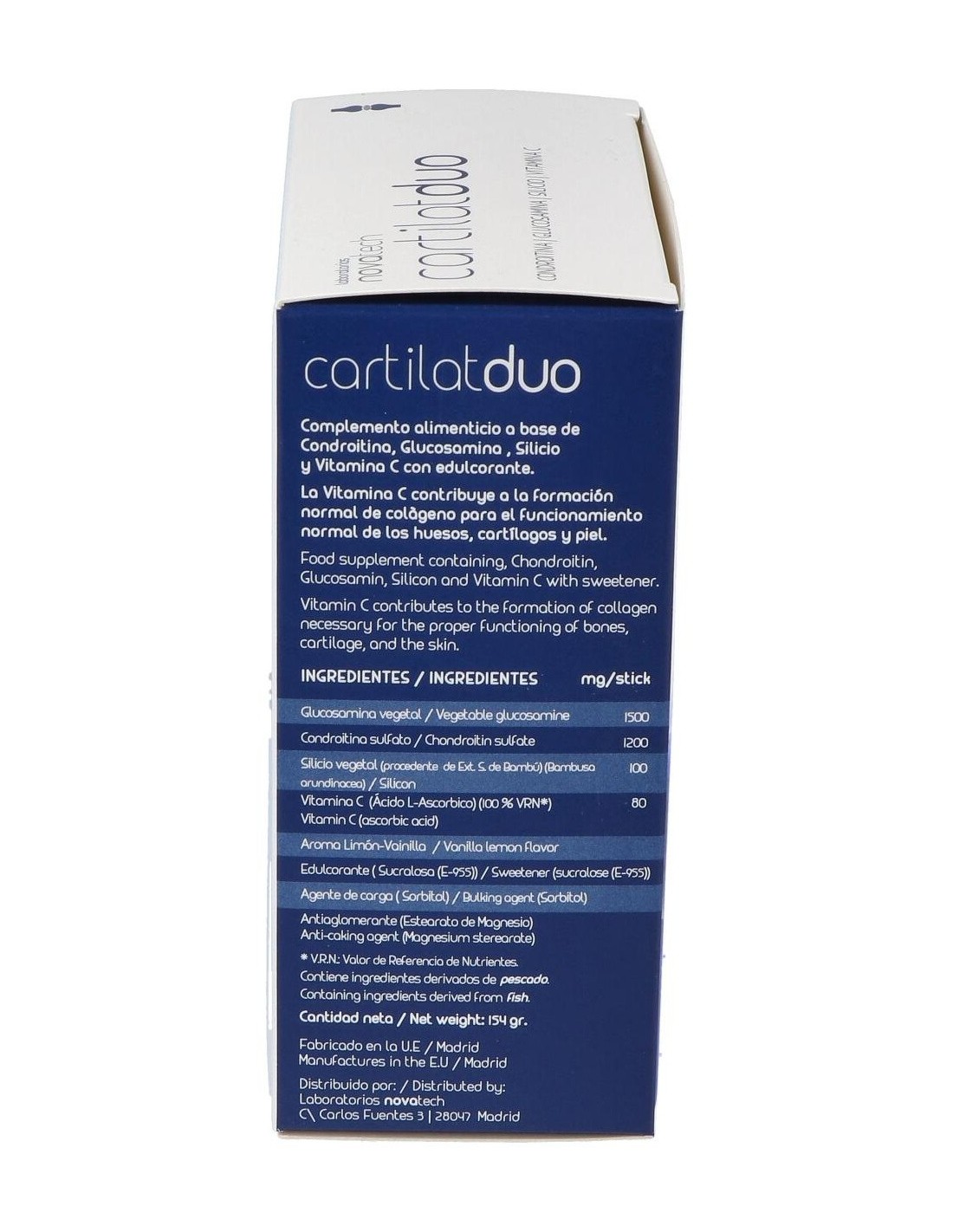 Glucosamina vegetal (1500 mg), condroitina sulfato (1200 mg), silicio vegetal (procedente de extracto seco de bambu (bambusa arundinacea)) (100 mg), vitamina C (ácido L-ascórbico) (80 mg), aroma limón-vainilla, edulcorante (sucralosa (E-955)), agente de carga (maltodextrina), antiaglomerante (estearato de magnesio).
