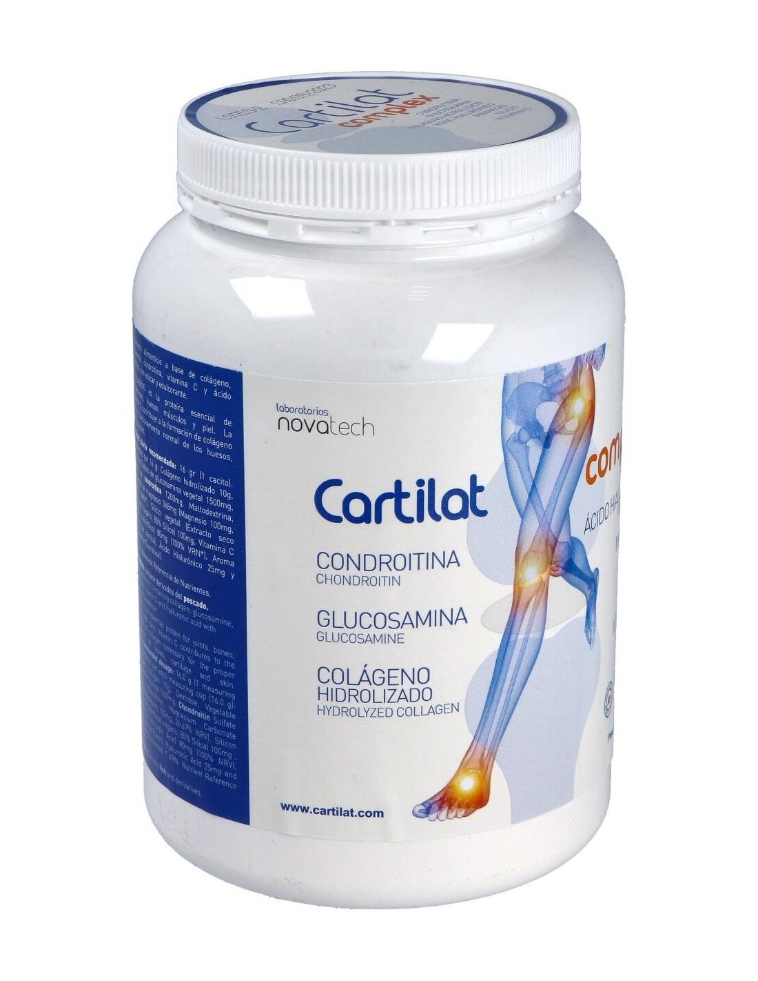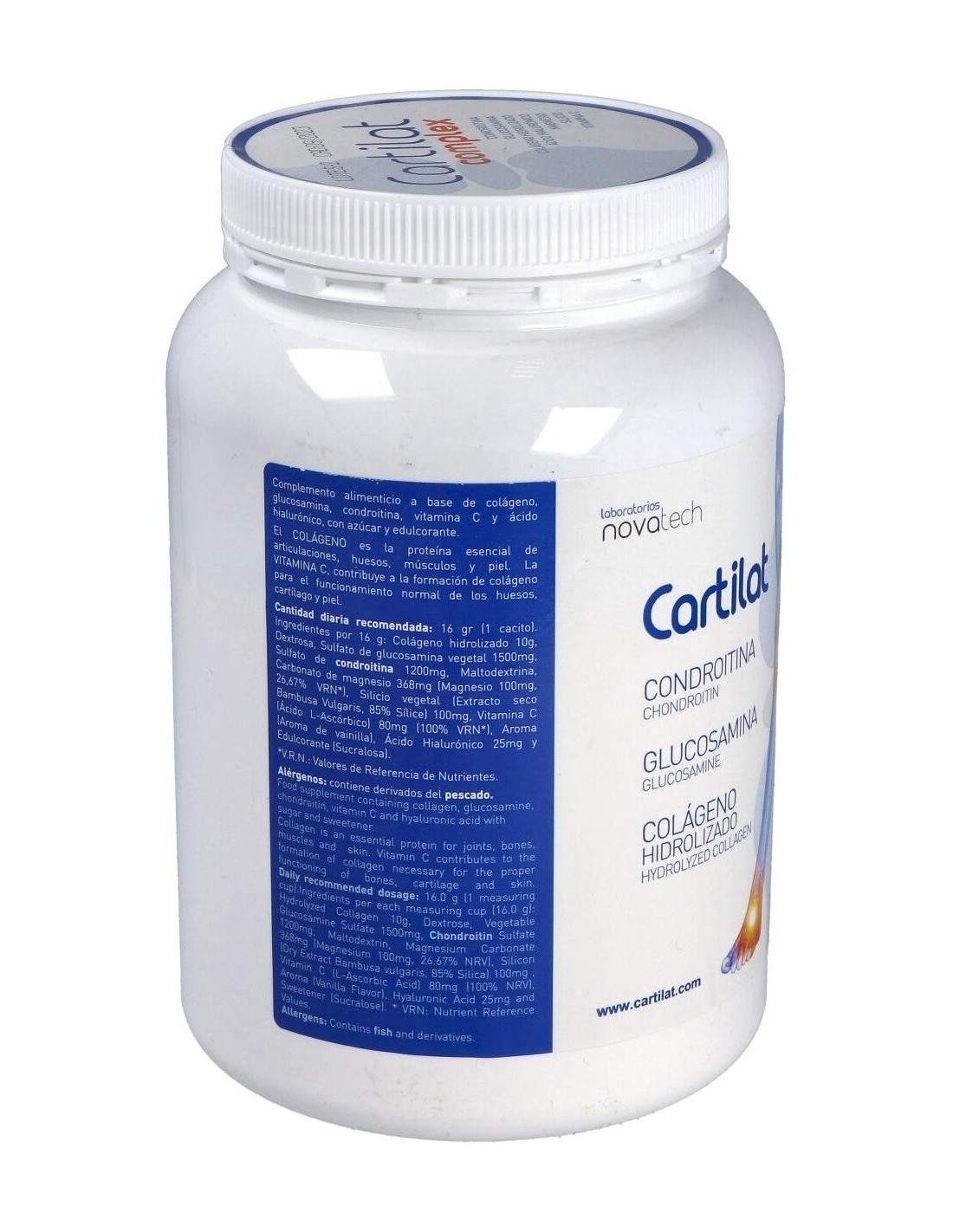 Complemento alimenticio Cartilat. Su composición, rica en colágeno y vitamina C, ayuda a mejorar y preservar el estado de las articulaciones. Gracias a sus principales componentes activos, favorece el funcionamiento adecuado de huesos y músculos. Sin embargo, como su nombre lo indica, se trata de un complemento a una dieta balanceada y un modo de vida sano. Es indicado en el tratamiento de problemas en las articulaciones para su regeneración. Además, favorece la formación de colágeno, fundamental en el normal funcionamiento, tanto de las articulaciones como de huesos, músculos y piel. Esta presentación corresponde a un polvo que facilita su ingesta disuelta en agua, jugo, leche, entre otros. Se recomienda no exceder una toma al día de la medida incorporada (15,3 gr). Está indicado para personas que presentan dolores articulares, atletas, etc.