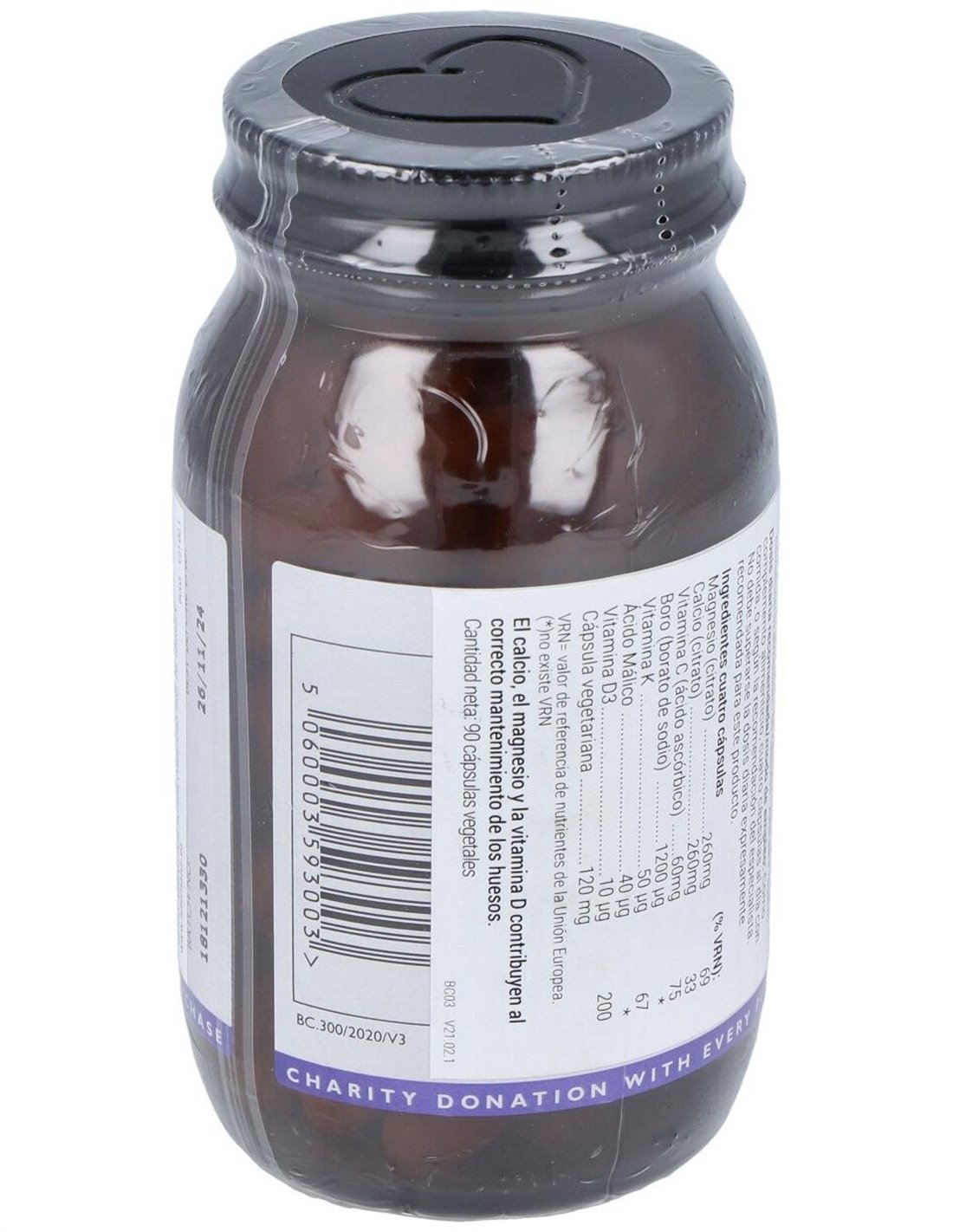 CALCIO 260 MG, CALCIO (AMINOQUELDO) 130 MG, CALCIO (CITRATO) 130 MG, MAGNESIO 260 MG, MAGNESIO (AMINOQUELADO) 130 MG, MAGNESIO (CITRATO) 130 MG, VITAMINA C (ÁCIDO ASCÓRBICO) 60 MG, ACIDO MÁLICO 40 MG, VITAMINA K2 (MENAQUINONA-7) 45 UG, BORO (AMINOQUELADO) 1200 UG, VITAMINA D2 (ERGOCALCIFEROL) 10 UG, CÁPSULA DE CELULOSA VEGETAL 120 MG.