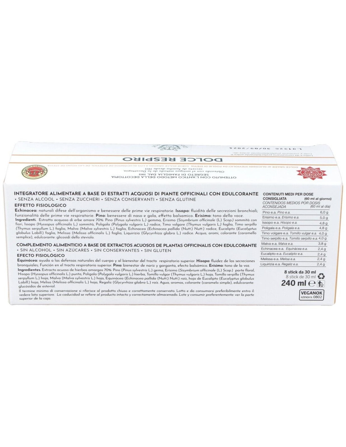 Complemento alimenticio útil para las afecciones de las vías respiratorias gracias a la sinergia de las plantas medicinales que conforman el producto. Está especialmente recomendado en casos de tos con flema, por sus propiedades fluidificantes del hisopo y balsámicas del pino. El erísimo, antiinflamatorio de las cuerdas vocales, favorece el tono normal de la voz.