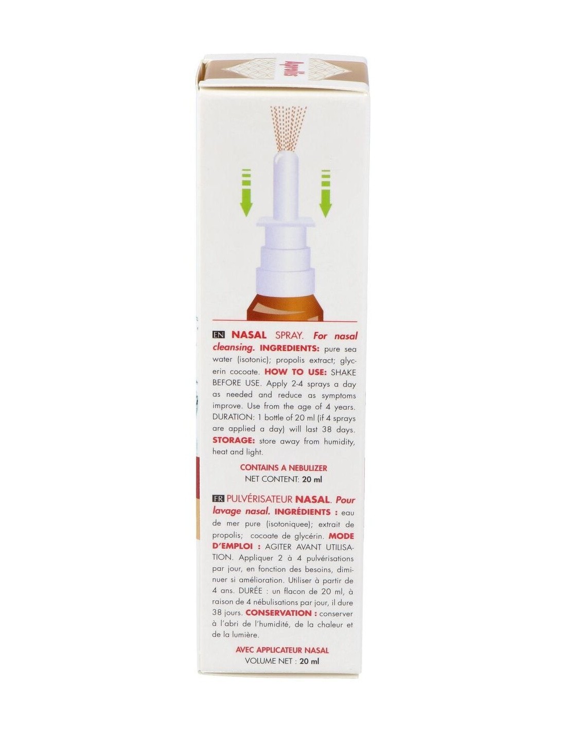 Spray nasal formulado a base de extracto concentrado de propóleo con agua de mar isotónica. Favorece la humectación y alivio de las vías nasales. Sus ingredientes tienen propiedades descongestivas y desinfectantes. Indicado para niños y adultos. No apto para menores de 4 años.