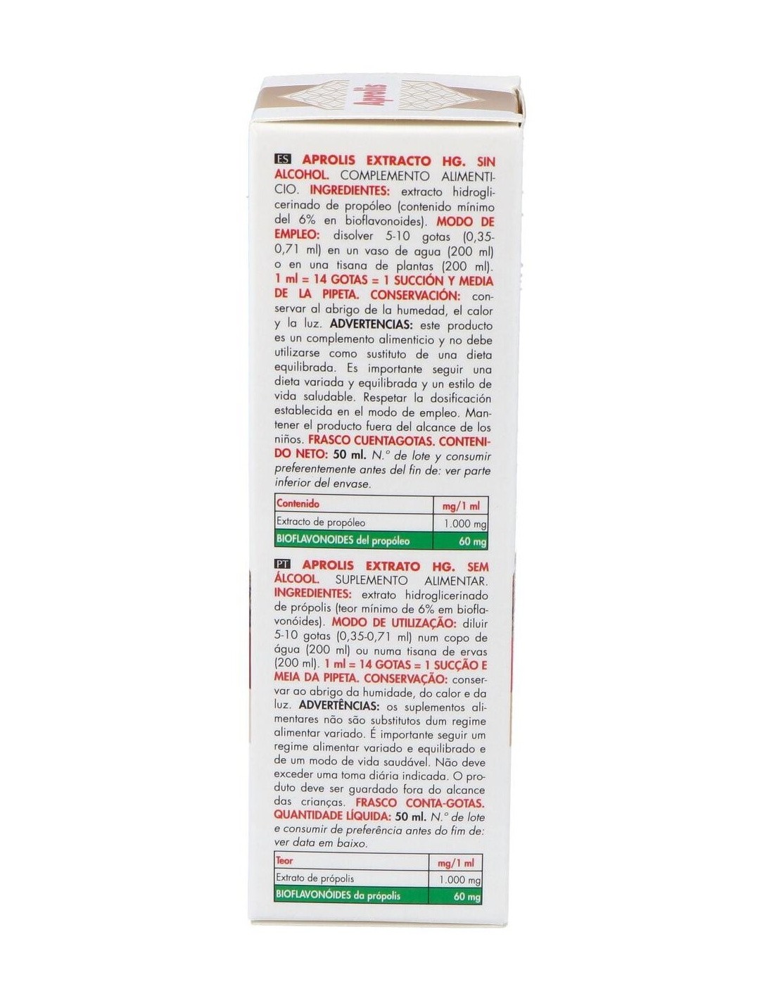 Es un complemento alimenticio a base de propóleo. Es un extracto fluido sin alcohol. El propóleo es un material similar a la resina fabricado por las abejas a partir de las yemas de los álamos y de los árboles conos. Con 6% bioflavonoides, ayuda a reforzar las defensas naturales del cuerpo. Con conocidas propiedades antibióticas , fungicida, bacteriana, cicatrizantes, antiinflamatorias, analgésicas, antialérgicas, epitelizantes y anestésicas. Apto consumo diario.