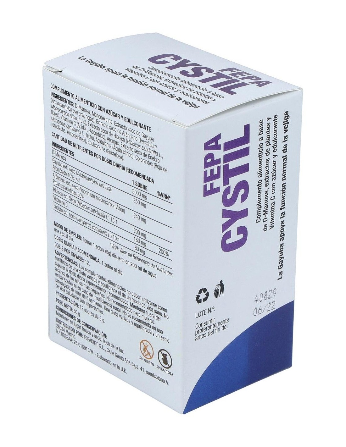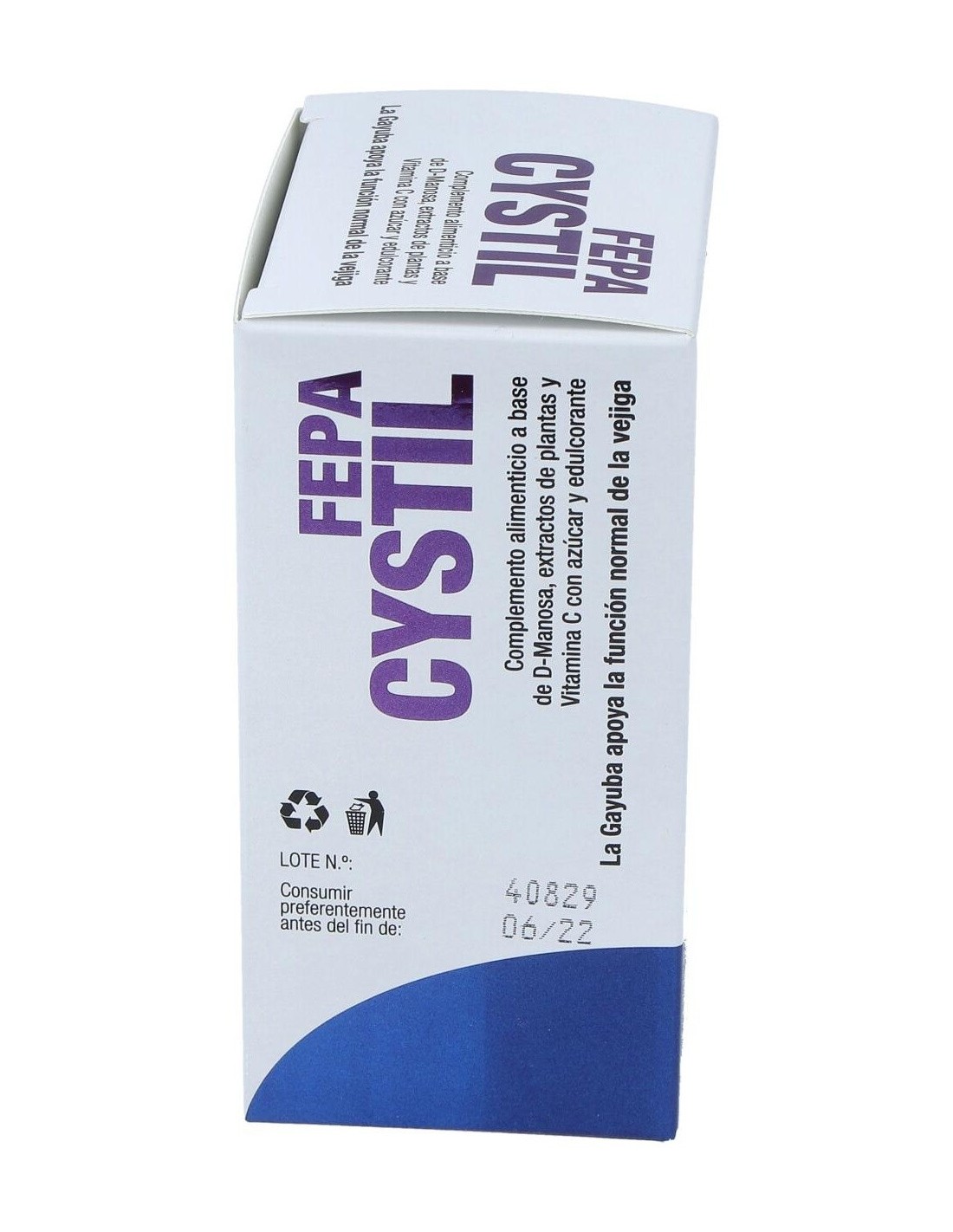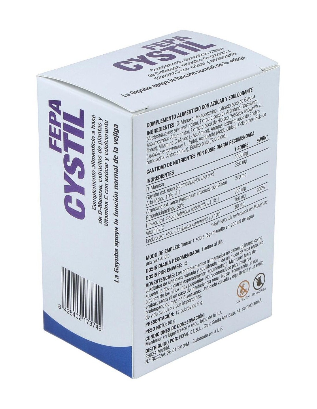 Complemento alimenticio a base de manosa, extractos de plantas y Vitamina C con azúcar y edulcorante. La Gayuba apoya la función normal de la vejiga.