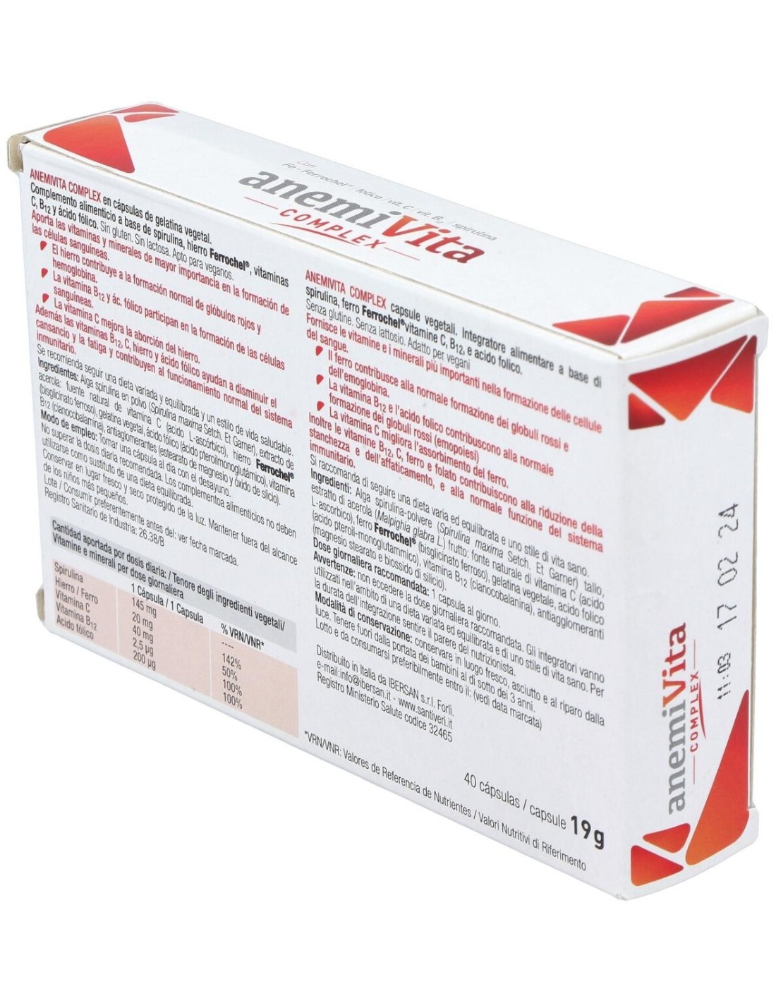 Alga espirulina en polvo (Spirulina máxima Setch. Et Garner), extracto de acerola: fuente natural de vitamina C (ácido L-ascórbico), hierro (bisglicinato ferroso), gelatina vegetal, ácido fólico (ácido pteroilmonoglutámico), vitamina B12 (cianocobalamina), antiaglomerantes (estearato de magnesio y óxido de silicio).