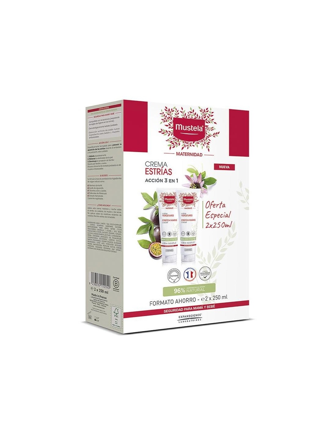 Crema que ayuda a prevenir las estrías del embarazo.Proporciona elasticidad a la piel, activando la producción de colágeno , elastina y fibronectina en la piel. Compuesto por cera de abejas y manteca de karité que hidratan y nutren la epidermis. Es compatible con la lactancia, desde el principio del embarazo y durante el post-parto. Textura de rápida absorción. Formato de 2 unidades de 250 ml.
