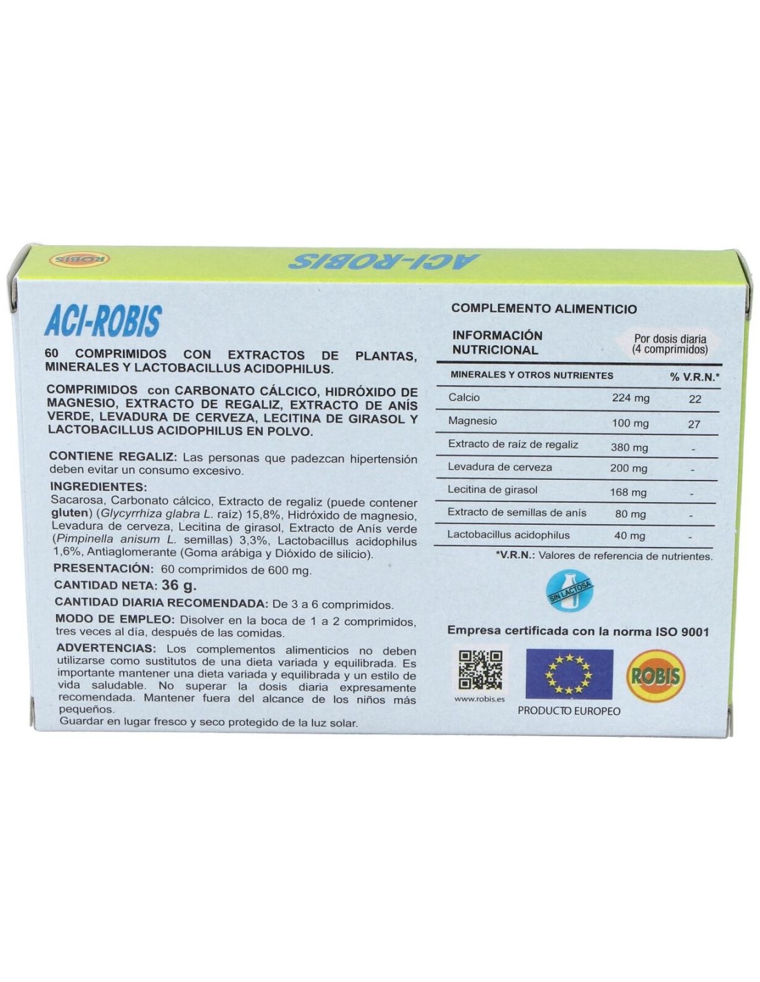 Sacarosa, Carbonato Cálcico, Extracto seco de raíz de Regaliz (Glycyrrhiza Glabra L.), Hidróxido de Magnesio, Levadura De Cerveza, Lecitina de Girasol, Extracto seco de semillas de Anís Verde (Pimpinella Anisum L.), Lactobacillus Acidophilus, Antiaglomerantes (Goma Arábiga, Dióxido de Silicio).