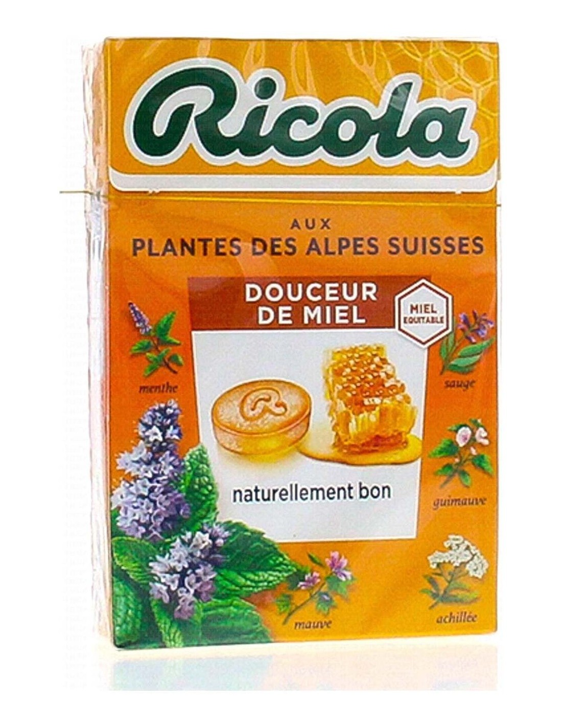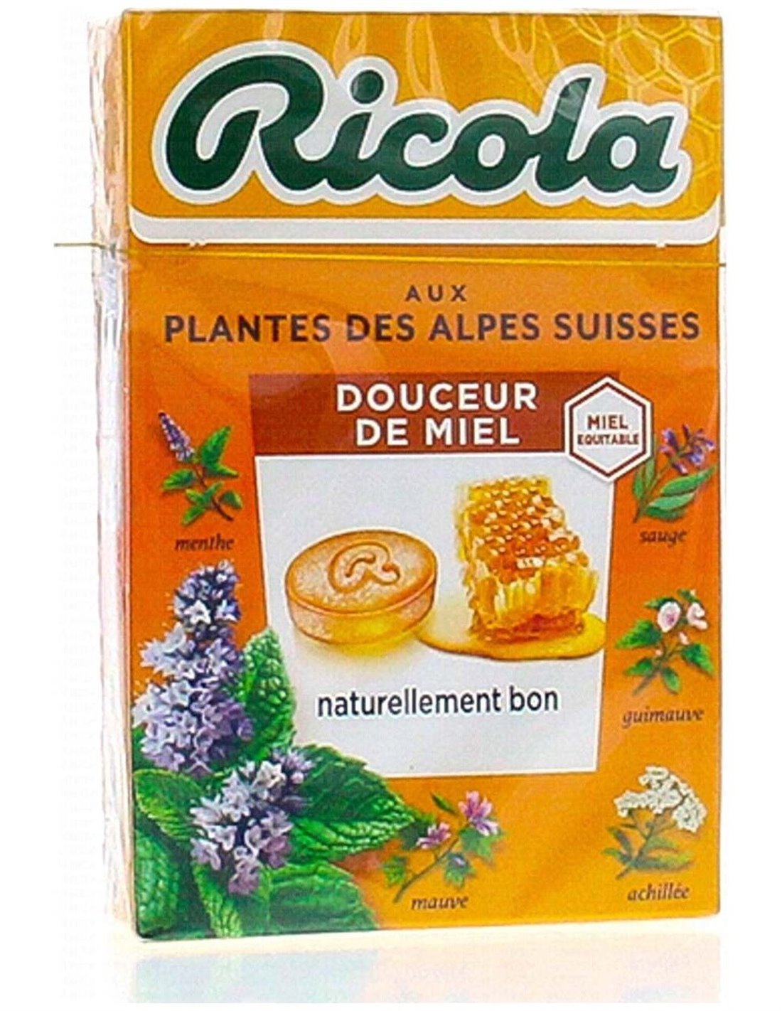 Azúcar, jarabe de glucosa, miel (5%), extracto (1,2%) de la mezcla de plantas aromáticas Ricola, aroma natural, colorante (caramelo natural), aceites esenciales de menta, mentol, agente de recubrimiento (goma arábiga). \ \ Valor nutricional por 100 g:\ Valor energético 1642 kJ/386 kcal\ Grasas, \ de las cuales 0 g\ - grasas saturadas 0 g\ Hidratos de carbono, 96 g\ de los cuales\ - azúcares 68 g\ Proteínas 0 g\ Sal 0.03 g\ \ Cada caramelo (2,5 g) contiene 2,7 mg de mentol.