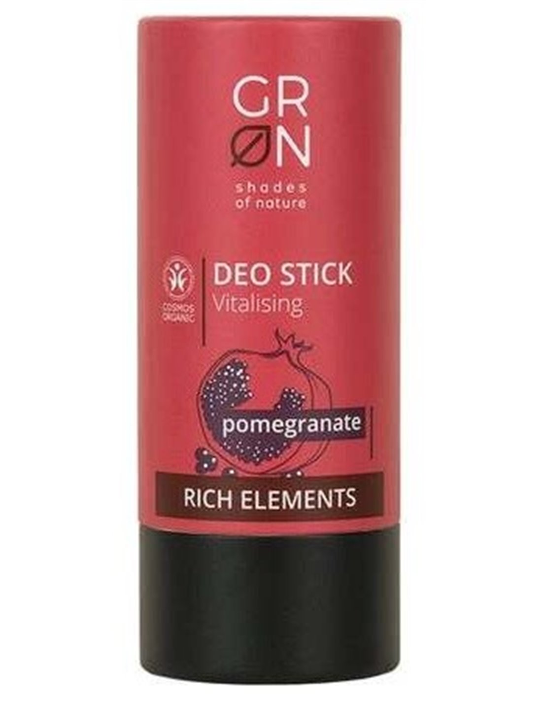 Desodorante stick que revitaliza y refresca la piel, con extracto de granada y aceite de oliva que hidrata la piel, acción antitranspirable y antibacteriana por lo que combate las bacterias causantes del mal olor. Fragancia fresca y natural. Producto certificado Cosmos Organic.