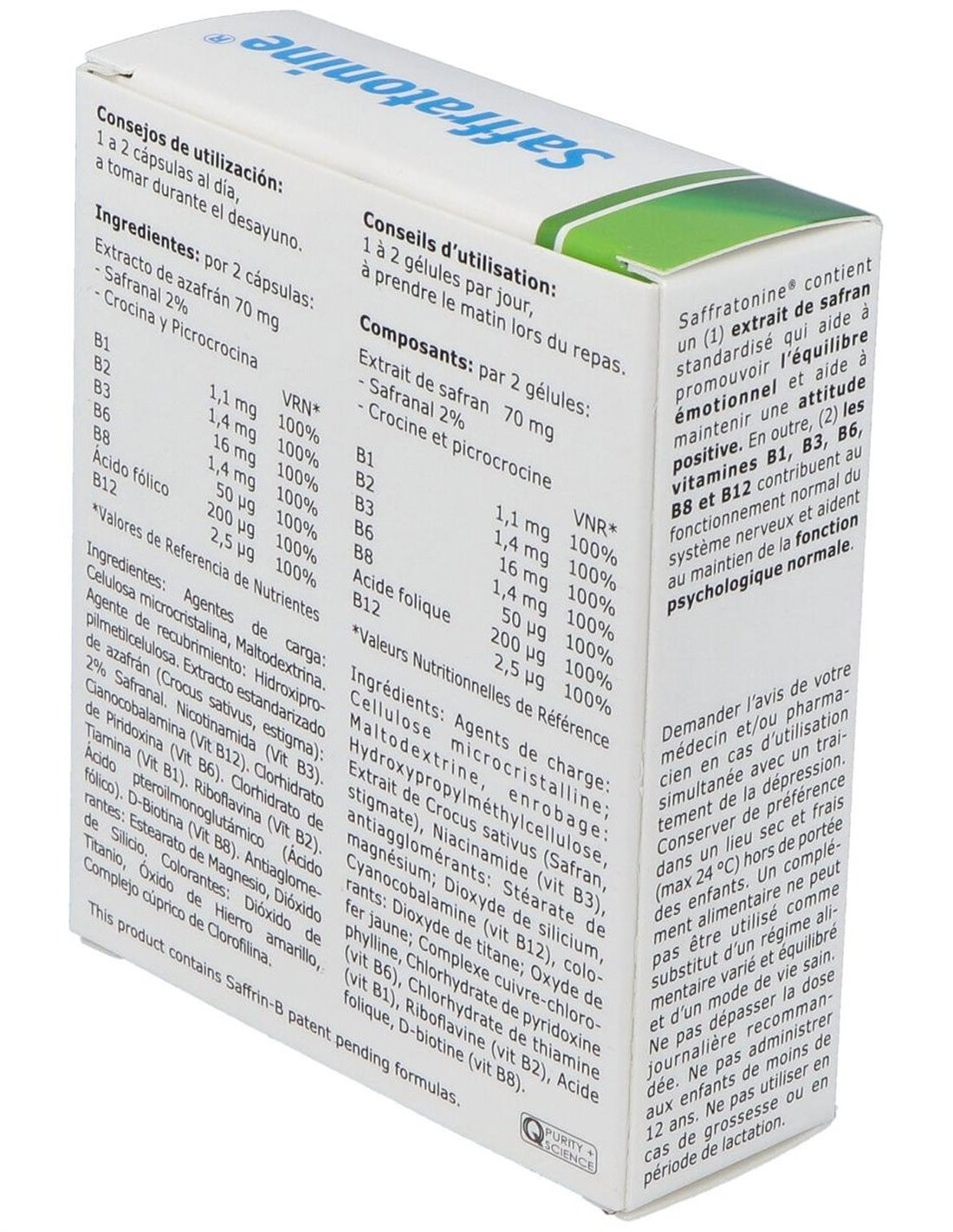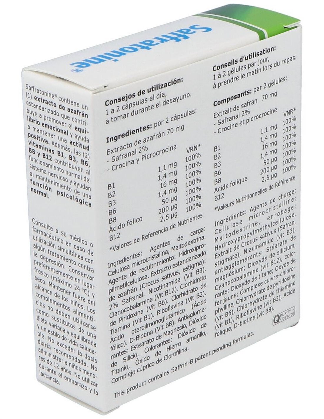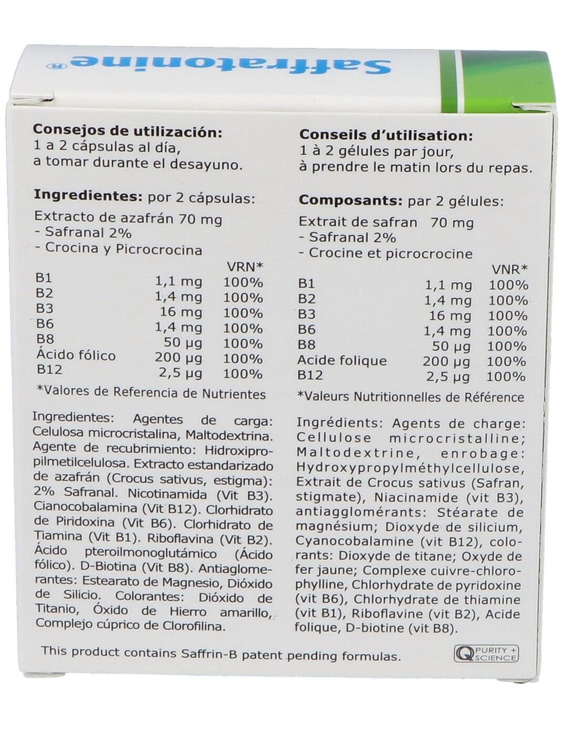 Agentes de carga: Celulosa microcristalina, maltodextrina, extracto estandarizado de azafrán (Crocus Sativus): 2%. Safranal, niacinamida, antiaglomerante: estearato de magnesio, dióxido de silicio, cianocabalamina, clorhidrato de piridoxina, clorhidrato de tiamina, riboflavina, ácido fólico, biotina. Cápsula vegetal V-cap: hipromelosa, colorante: dióxido de titanio, óxido de hierro amarillo, complejo de clorofilina de cobre.