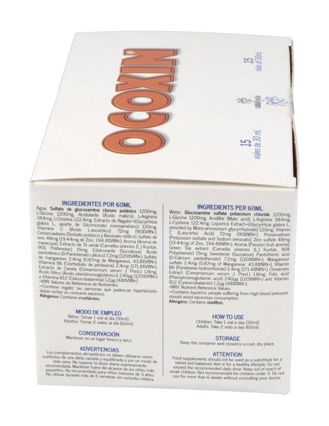 L-Glicina, Sulfato De Glucosamina, L-Arginina, L-Cistéina, Regaliz (Glycyrrhiza Glabra L.), Vitamina C (Ácido L-Ascórbico), Agua, Sulfato De Zinc, Té Verde (Camellia Sinensis (L.) Kuntze), Vitamina B5 (D-Pantotenato De Calcio), Vitamina B6 (Clorhidrato De Piridoxina), Sulfato De Manganeso, Canela (Cinnamomum Zeylanicum Blume), Ácido Fólico (Ácido Pteroilmonoglutámico), Vitamina B12 (Cianobalamina), Acidulante (Ácido Málico) Y Conservante (Metilparaben Sódico).