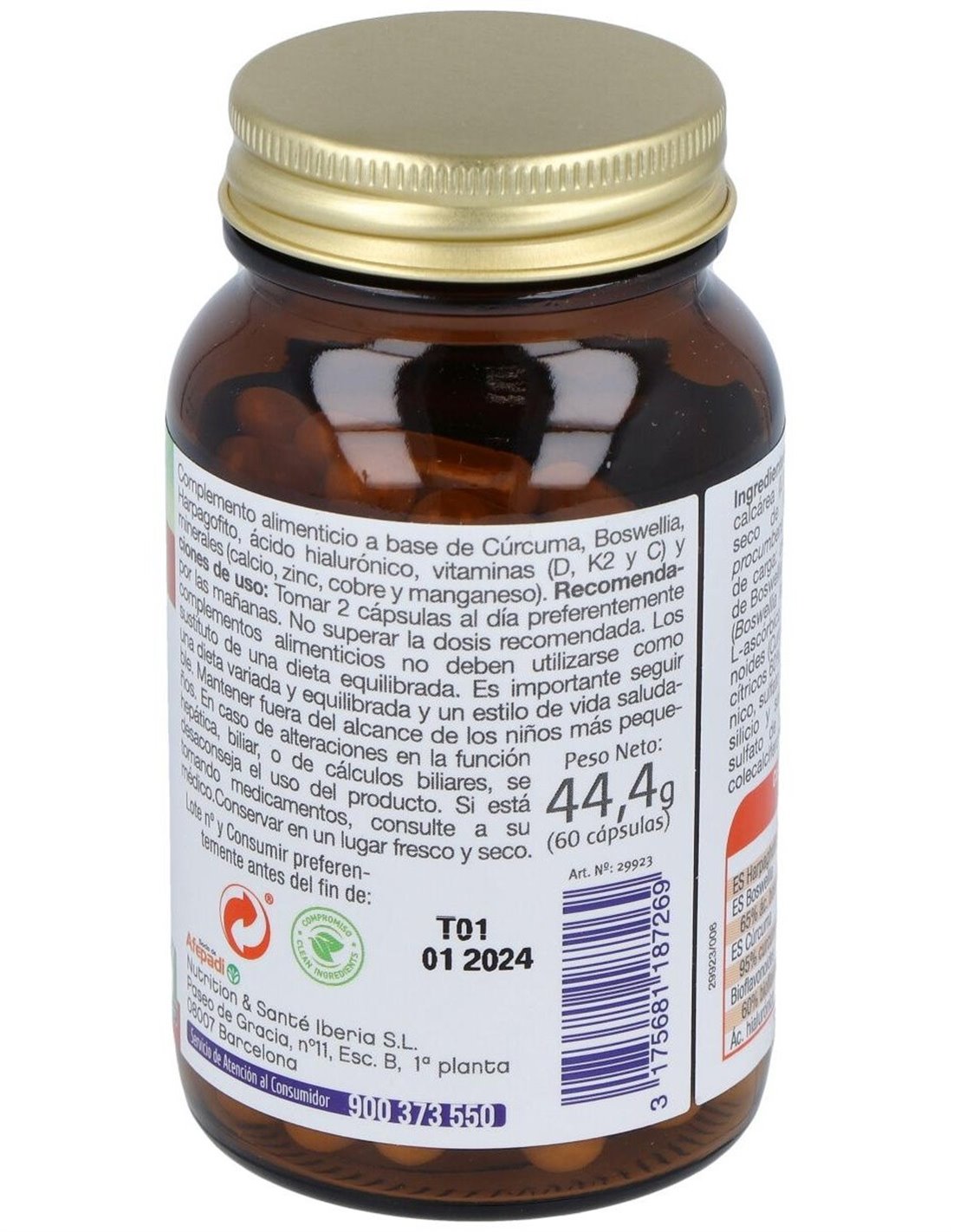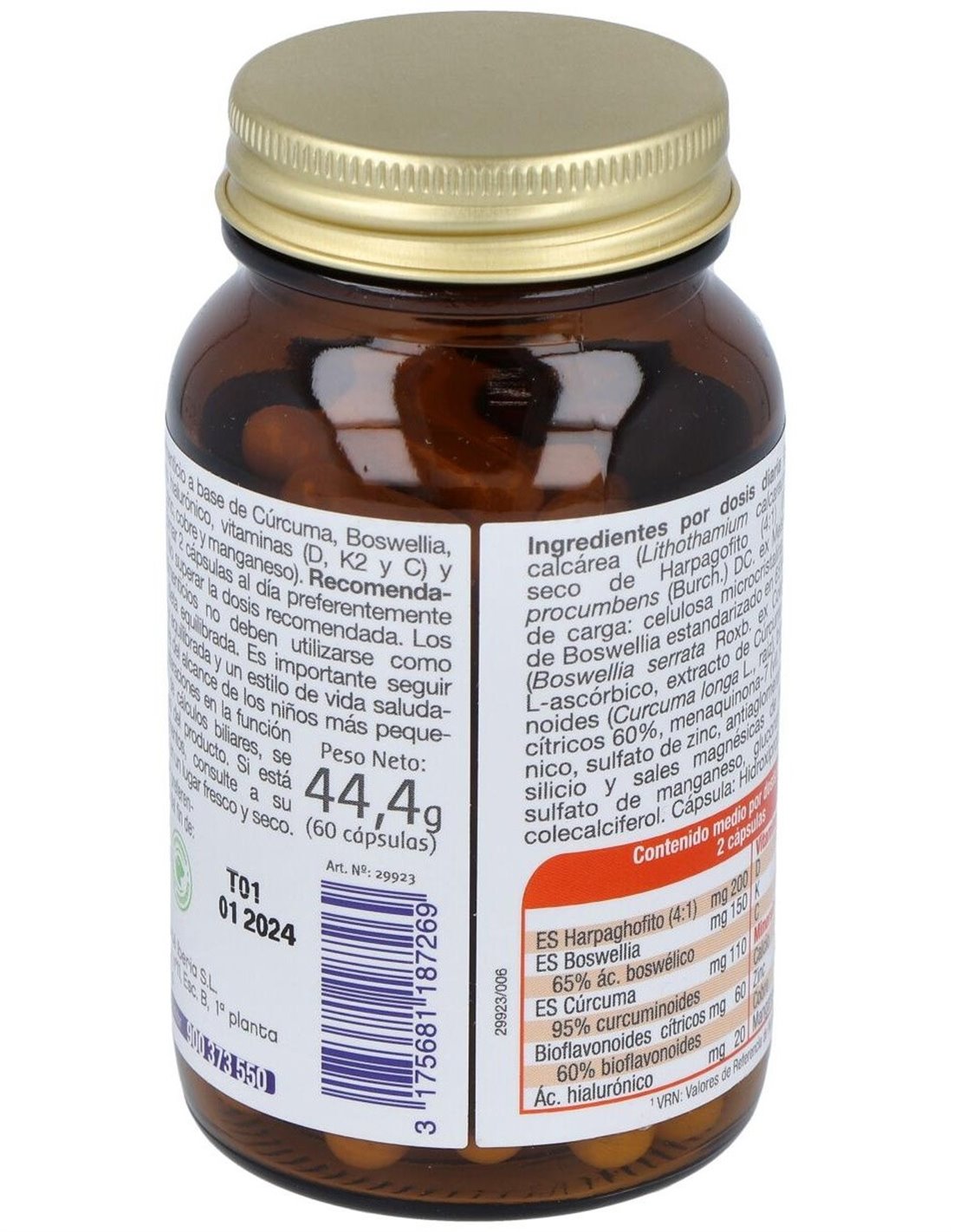 ALGA CALCÁREA (LITHOTHAMIUM CALCAREUM L.): 353 MG, EXTRACTO SECO DE HARPAGOFITO (4:1) (HARPAGOPHYTUM PROCUMBENS (BURCH.) DC. EX MEISN., RAÍZ):200 MG, AGENTE DE CARGA: CELULOSA MICROCRISTALINA, EXTRACTO SECO DE BOSWELLIA ESTANDARIZADO EN 65% ÁC. BOSWÉLLICO (BOSWELLIA SERRATA ROXB. EX COLEBR. RESINA): 150 MG, ÁC. LASCÓRBICO, EXTRACTO DE CÚRCUMA 95% CURCUMINOIDES (CURCUMA LONGA L., RAIZ ): 110 MG, BIOFLAVONOIDES DE CÍTRICOS 60%: 60 MG (BIOFLAVONOIDES: 36 MG), MENAQUINONA-7 (VIT. K2), ÁC. HIALURÓNICO: 20 MG, SULFATO DE ZINC, ANTIAGLOMERANTES: DIÓXIDO DE SILICIO Y SALES MAGNÉSICAS DE ÁCIDOS GRASOS, SULFATO DE MANGANESO, GLUCONATO DE ZINC Y COLECALCIFEROL. CÁPSULA VEGETAL: HIDROXIPROPILMETILCELULOSA.