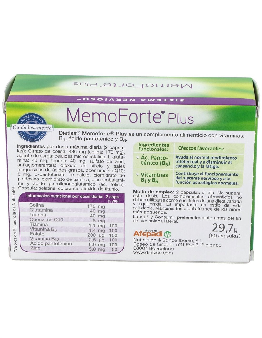 Dietisa Memoforte Plus 60cap es un complemento alimenticio formulado a base de lecitina de soja rica en fosfatidilicolina, aminoácidos, coenzima Q10 y vitaminas B1, ácido pantotémico y vitamina B6.