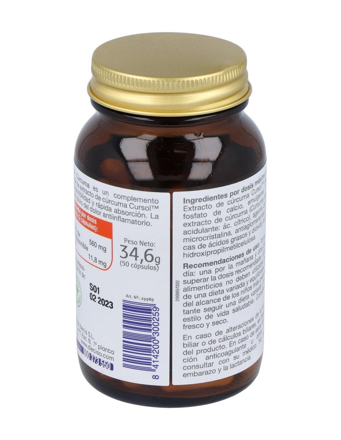 Cápsulas elaboradas a base de cúrcuma. Ayuda a aliviar el dolor inflamatorio.La cúrcuma es una planta originaria de la India cuya raíz es rica en curcuminoides, un tipo de flavonoides con múltiples efectos beneficiosos en el organismo. Con extracto de cúrcuma Cursol, una cúrcuma optimizada gracias a un exclusivo y patentado proceso que incrementa su solubilidad y optimiza su biodisponibilidad. Sin lactosa, gluten ni ingredientes de origen animal.