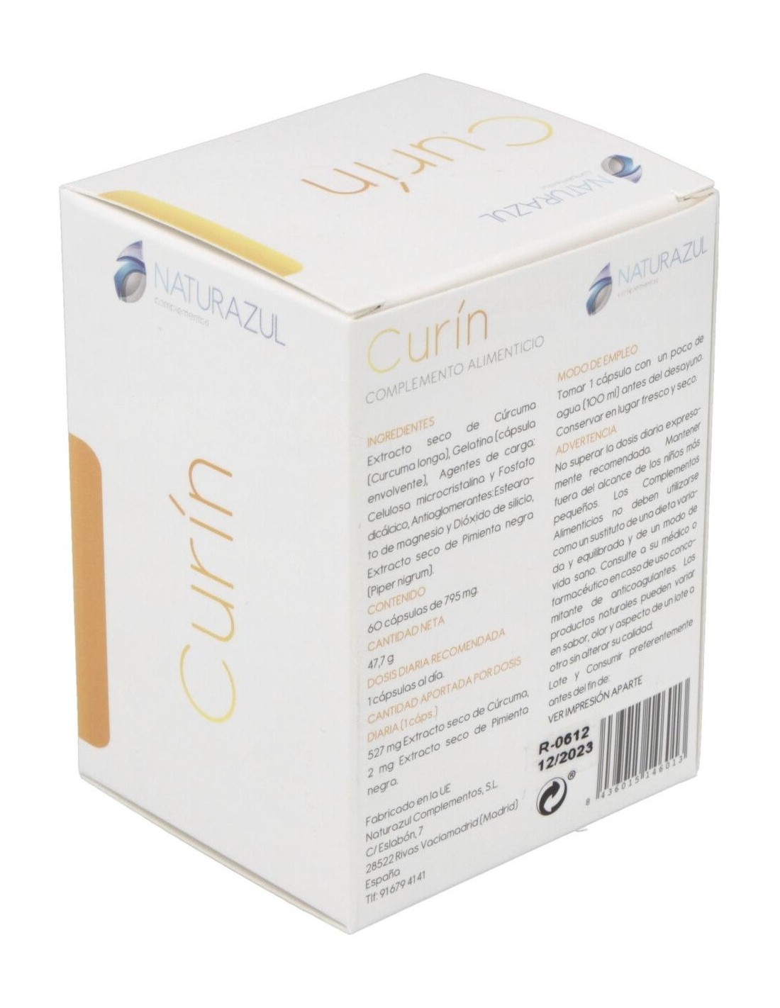 Extracto seco de Cúrcuma (Curcuma longa), Gelatina (cápsula envolvente), Agentes de carga: Celulosa micocristalina y Fosfato dicálcico, Antiaglomerantes: Estearato de magnesio y Dióxido de silicio, Extracto seco de pimienta negra (Piper nigrum).