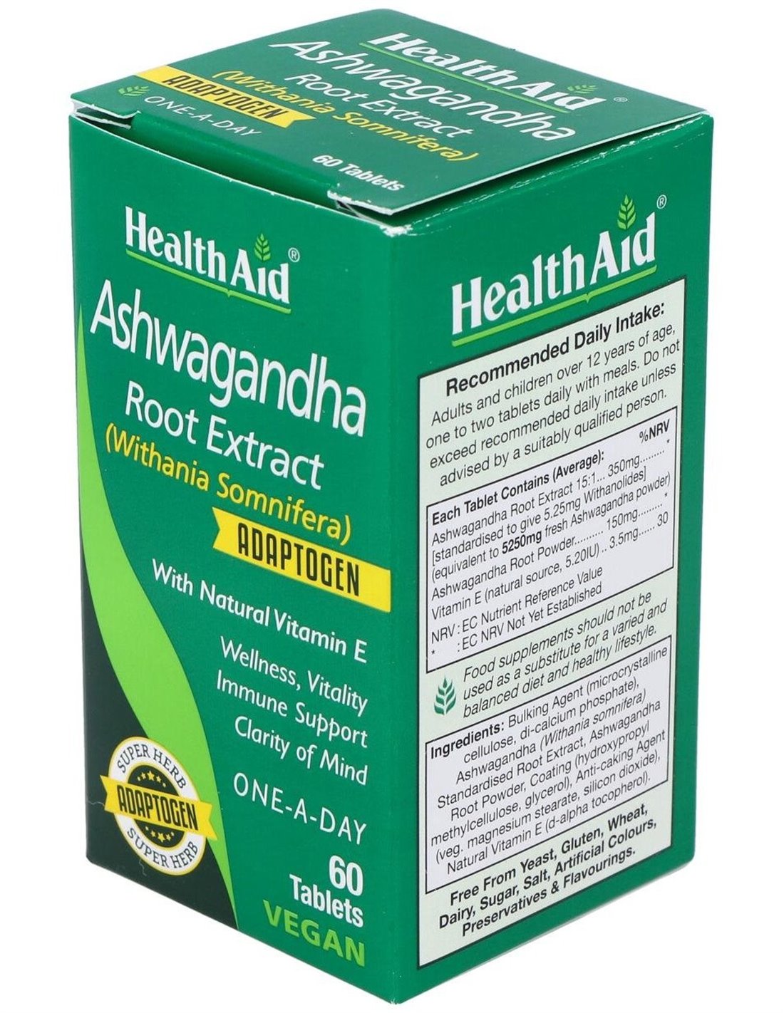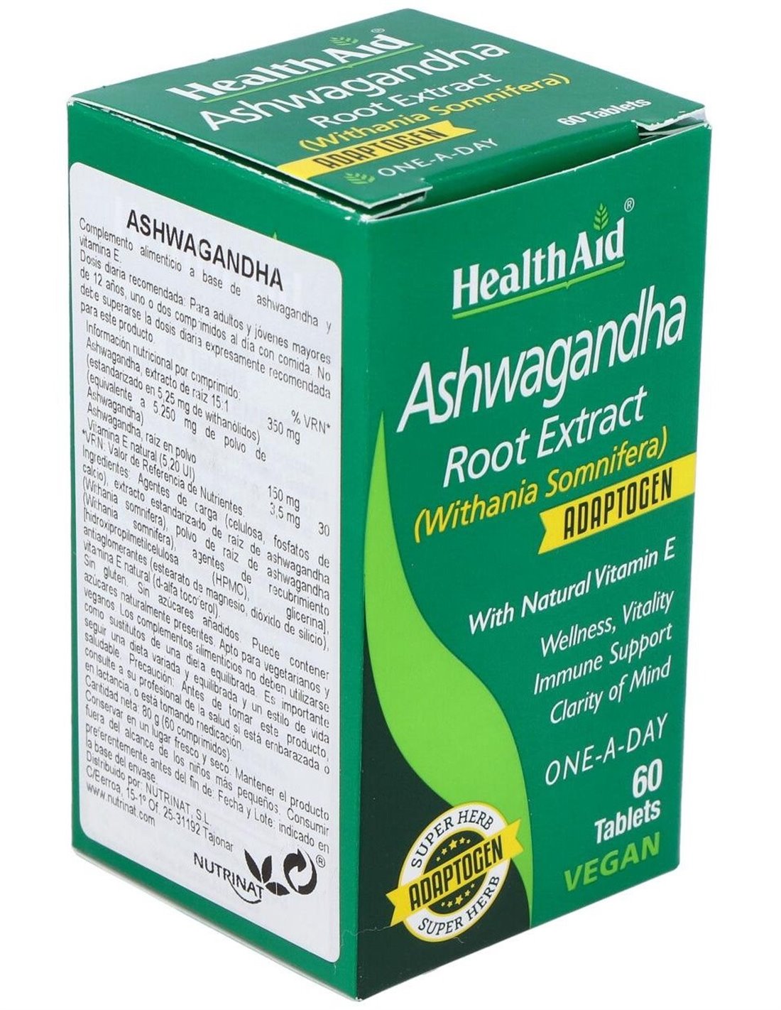 Contiene extracto y polvo de raíz de ashwagandha, aportando 5,25 mg de withanólidos por comprimido, y vitamina E natural por su aporte antioxidante, beneficioso en patologías como estrés, ansiedad y depresión, las cuales generan en el organismo una gran cantidad de radicales libres. Apto para veganos.