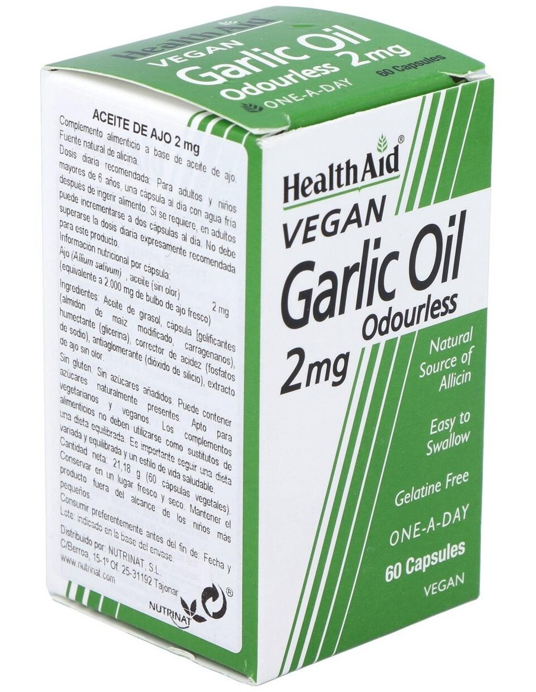 Ajo (Allium sativum), aceite (sin olor) (equivalente a 2.000 mg de bulbo de ajo fresco)...............................................2 mg