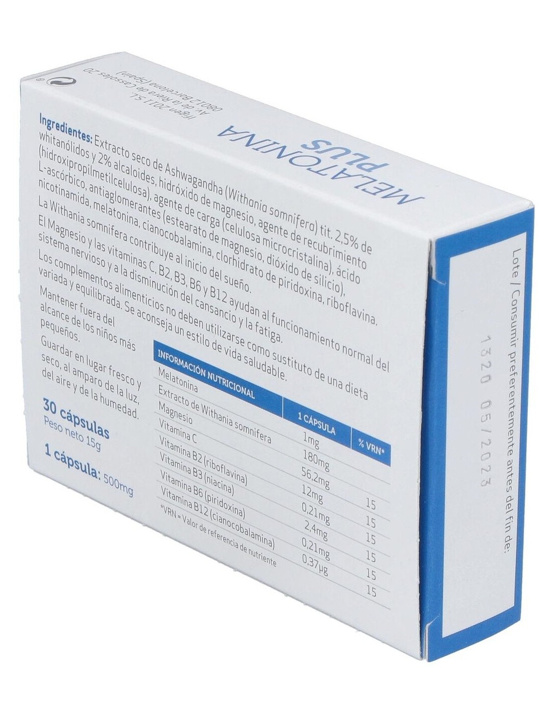 Complemento alimenticio en formato cápsulas a base de melatonina y ashwagandha, que está indicado para ayudar a disminuir el tiempo para conciliar el sueño. Además contiene magnesio y vitaminas B y C, que ayudan al funcionamiento normal del sistema nervioso y a la disminución del cansancio y la fatiga.