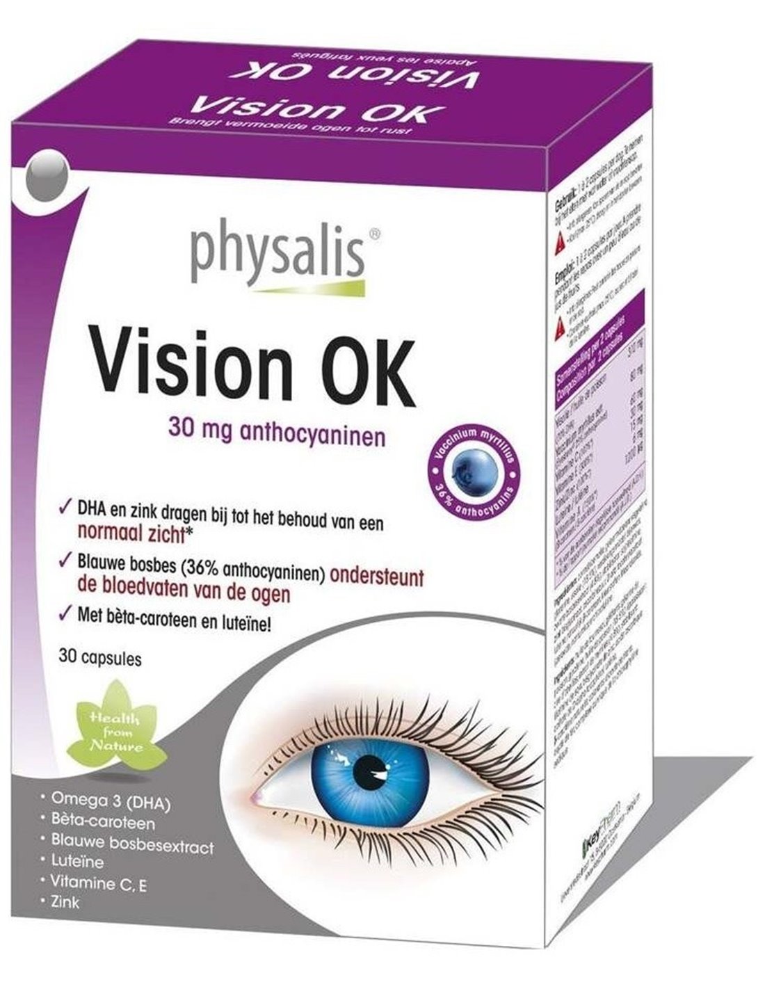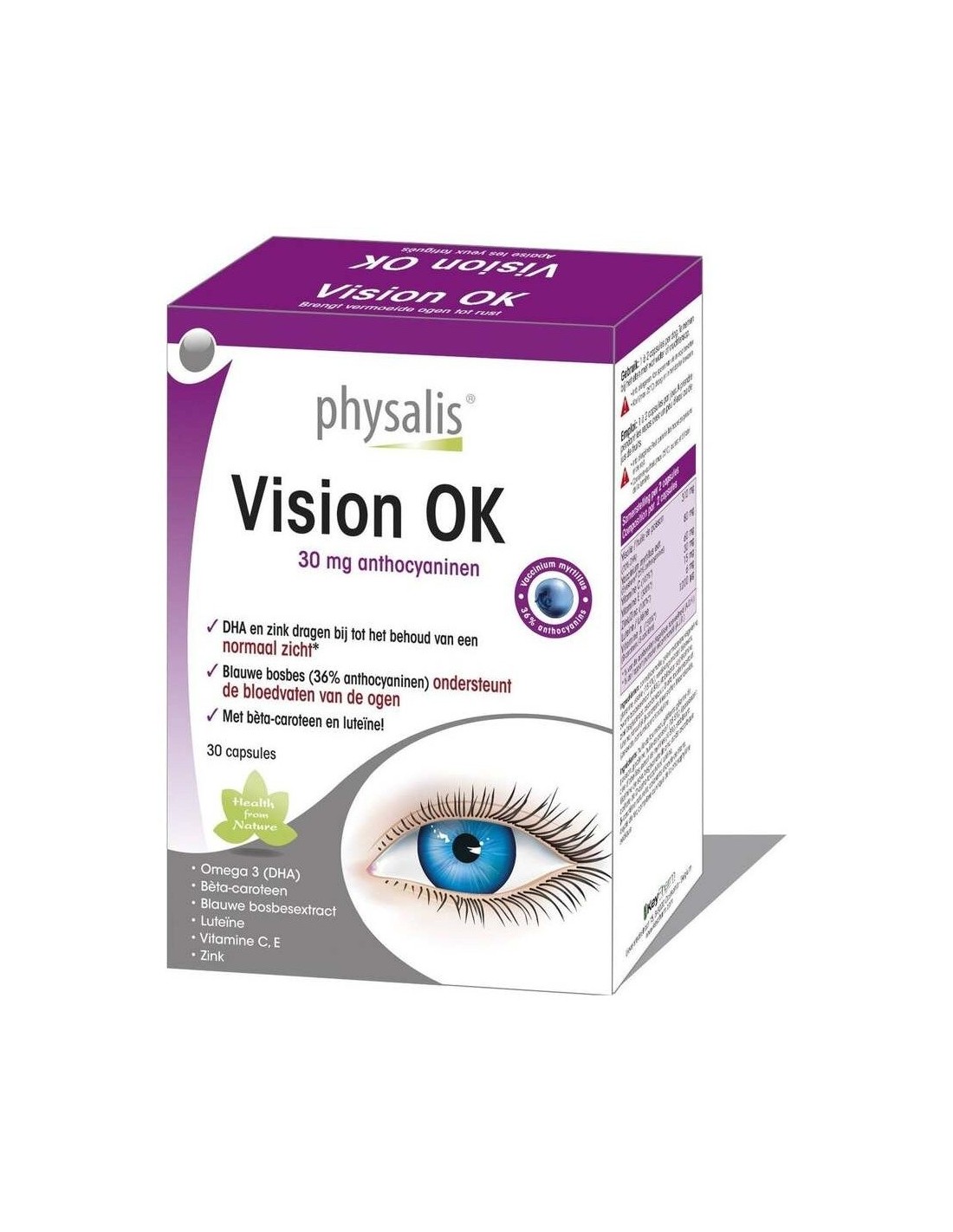 Complemento alimenticio elaborado a base de plantas y nutrientes naturales que contribuye al buen mantenimiento de la visión. Su contenido en zinc y aceite de pescado, aportan ácido graso omega 3 DHA que ayuda a mejorar la circulación de la sangre en los ojos, las vitaminas C y E ayudan a proteger las células de los ojos contra los radicales libres, favoreciendo la secreción de fluido intraocular, cooperando en la reducción del riesgo de presión ocular. Además de aportar una protección contra la degeneración muscular y el síndrome del ojo seco.
